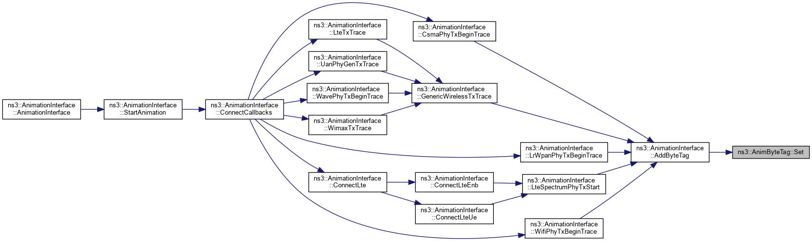 Here is the call graph for this function:| void ns3::AnimByteTag::Set | ( | uint64_t | AnimUid | ) |