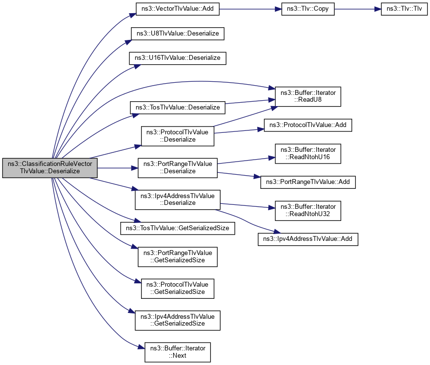 References ns3::VectorTlvValue::Add(), ns3::U8TlvValue::Deserialize(), ns3::U16TlvValue::Deserialize(), ns3::TosTlvValue::Deserialize(), ns3::PortRangeTlvValue::Deserialize(), ns3::ProtocolTlvValue::Deserialize(), ns3::Ipv4AddressTlvValue::Deserialize(), ns3::TosTlvValue::GetSerializedSize(), ns3::PortRangeTlvValue::GetSerializedSize(), ns3::ProtocolTlvValue::GetSerializedSize(), ns3::Ipv4AddressTlvValue::GetSerializedSize(), Index, IP_dst, IP_src, ns3::Buffer::Iterator::Next(), Port_dst, Port_src, Priority, Protocol, ns3::Buffer::Iterator::ReadU8(), ToS, and WIMAX_TLV_EXTENDED_LENGTH_MASK.