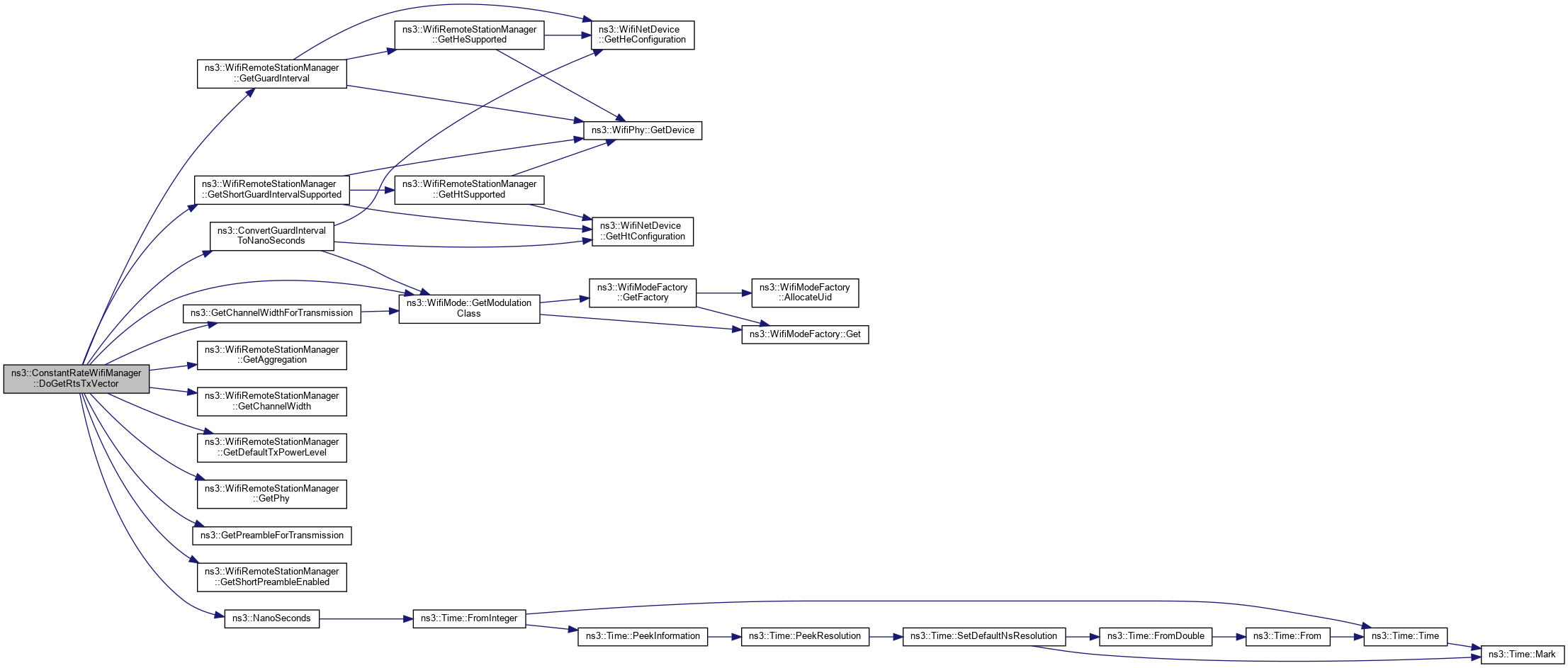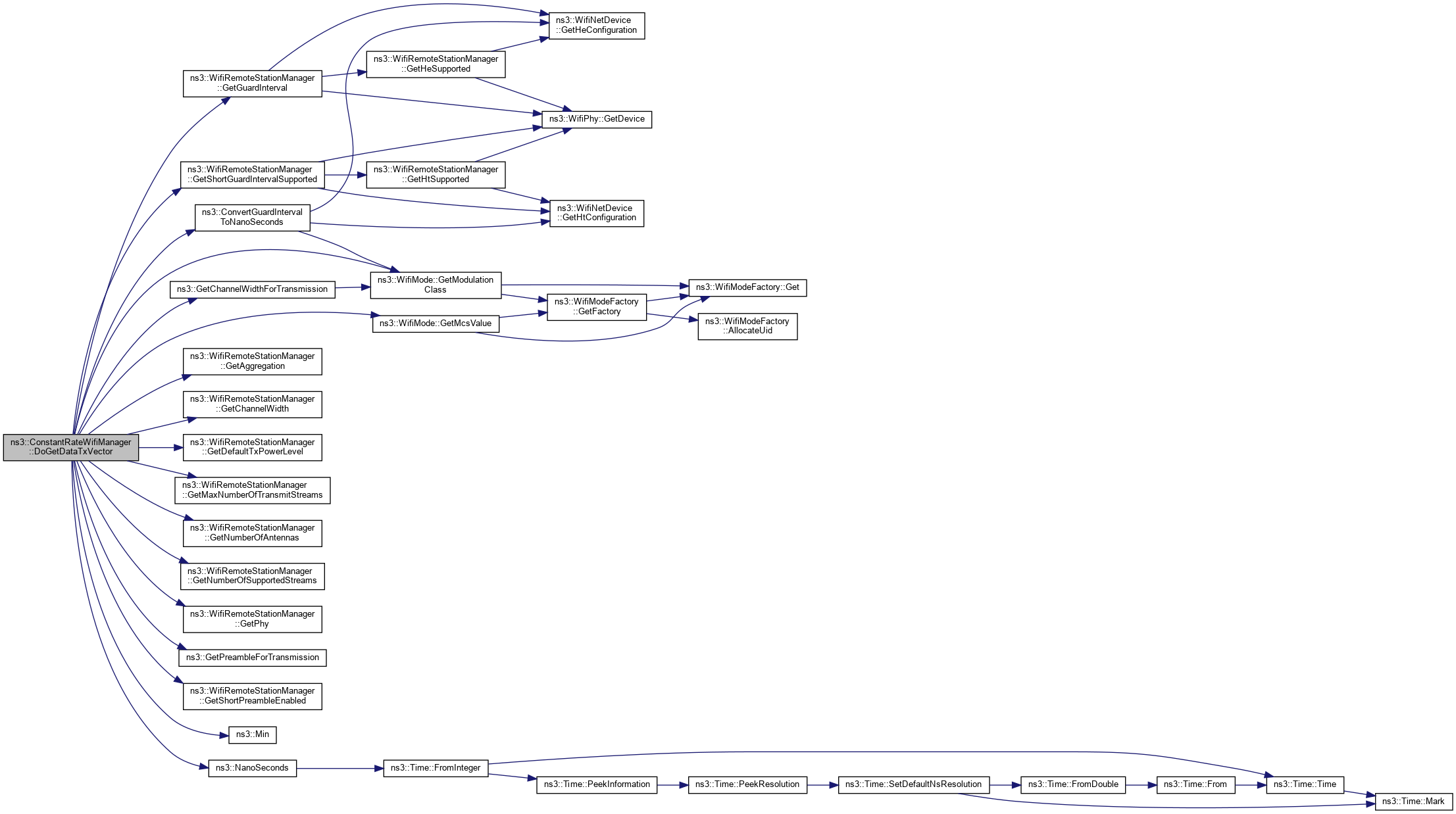References ns3::ConvertGuardIntervalToNanoSeconds(), ns3::WifiRemoteStationManager::GetAggregation(), ns3::WifiRemoteStationManager::GetChannelWidth(), ns3::GetChannelWidthForTransmission(), ns3::WifiRemoteStationManager::GetDefaultTxPowerLevel(), ns3::WifiRemoteStationManager::GetGuardInterval(), ns3::WifiRemoteStationManager::GetMaxNumberOfTransmitStreams(), ns3::WifiMode::GetMcsValue(), ns3::WifiMode::GetModulationClass(), ns3::WifiRemoteStationManager::GetNumberOfAntennas(), ns3::WifiRemoteStationManager::GetNumberOfSupportedStreams(), ns3::WifiRemoteStationManager::GetPhy(), ns3::GetPreambleForTransmission(), ns3::WifiRemoteStationManager::GetShortGuardIntervalSupported(), ns3::WifiRemoteStationManager::GetShortPreambleEnabled(), m_dataMode, ns3::Min(), ns3::NanoSeconds(), NS_LOG_FUNCTION, and ns3::WIFI_MOD_CLASS_HT.
