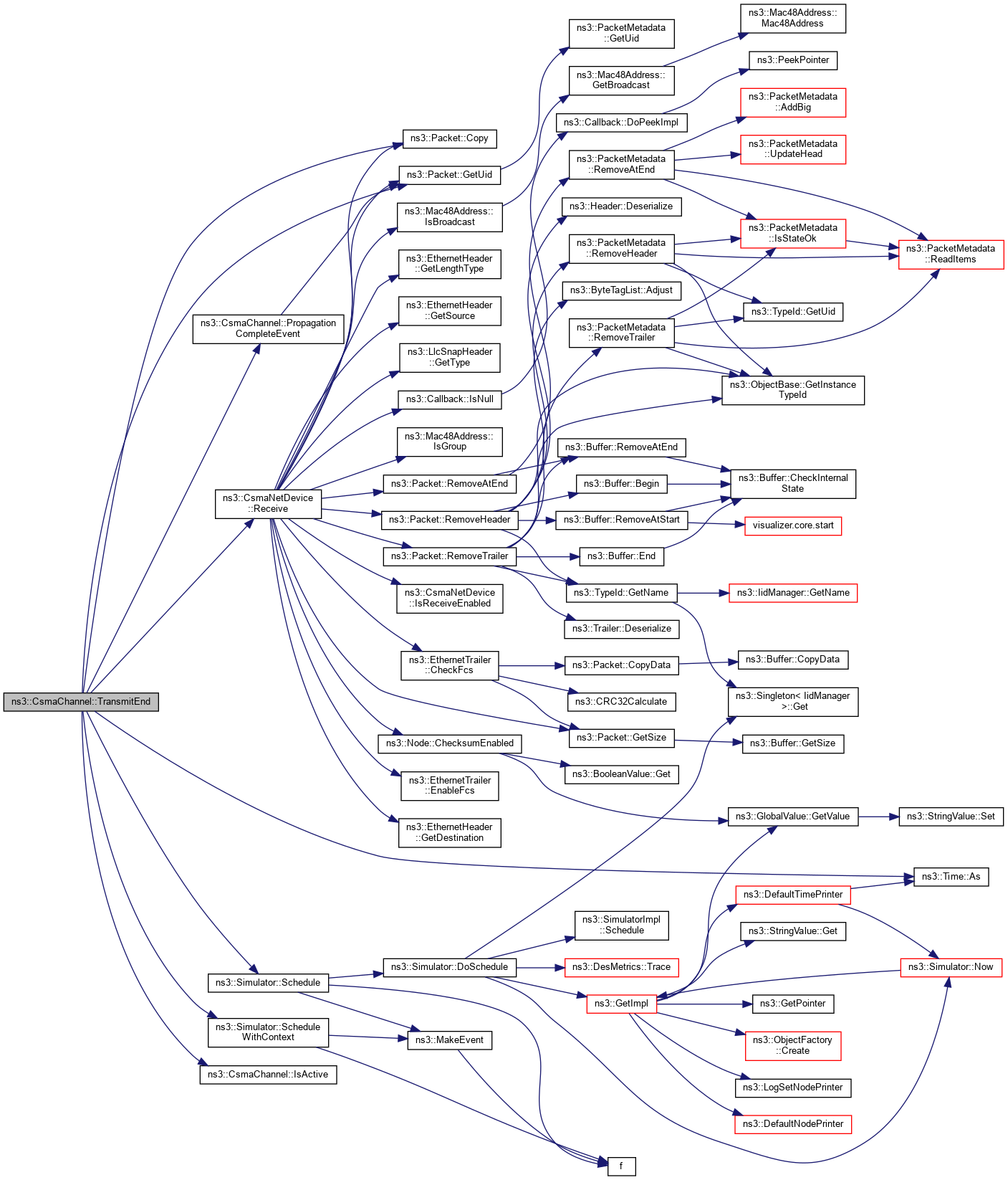 The channel will stay busy until the packet has completely propagated to all net devices attached to the channel. The TransmitEnd function schedules the PropagationCompleteEvent which will free the channel for further transmissions. Stores the packet p as the m_currentPkt, the packet being currently transmitting.