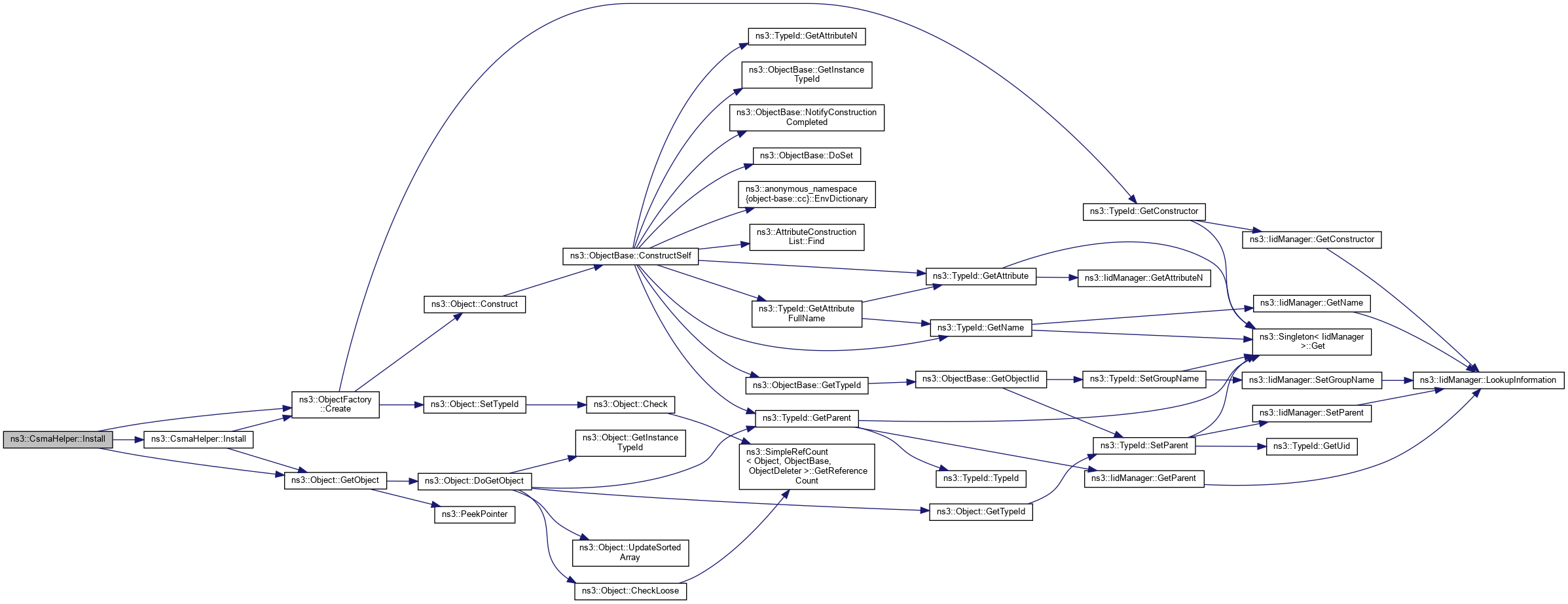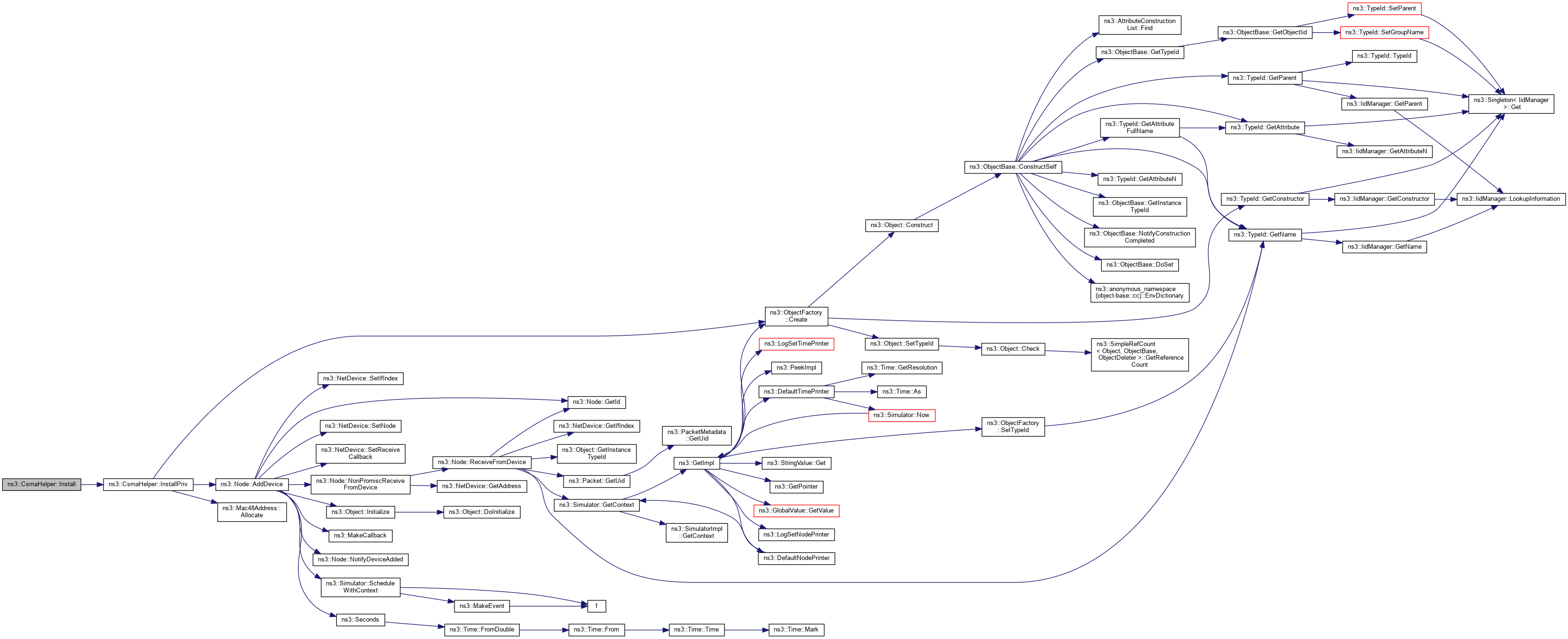 Here is the call graph for this function:| NetDeviceContainer ns3::CsmaHelper::Install | ( | const NodeContainer & | c, |