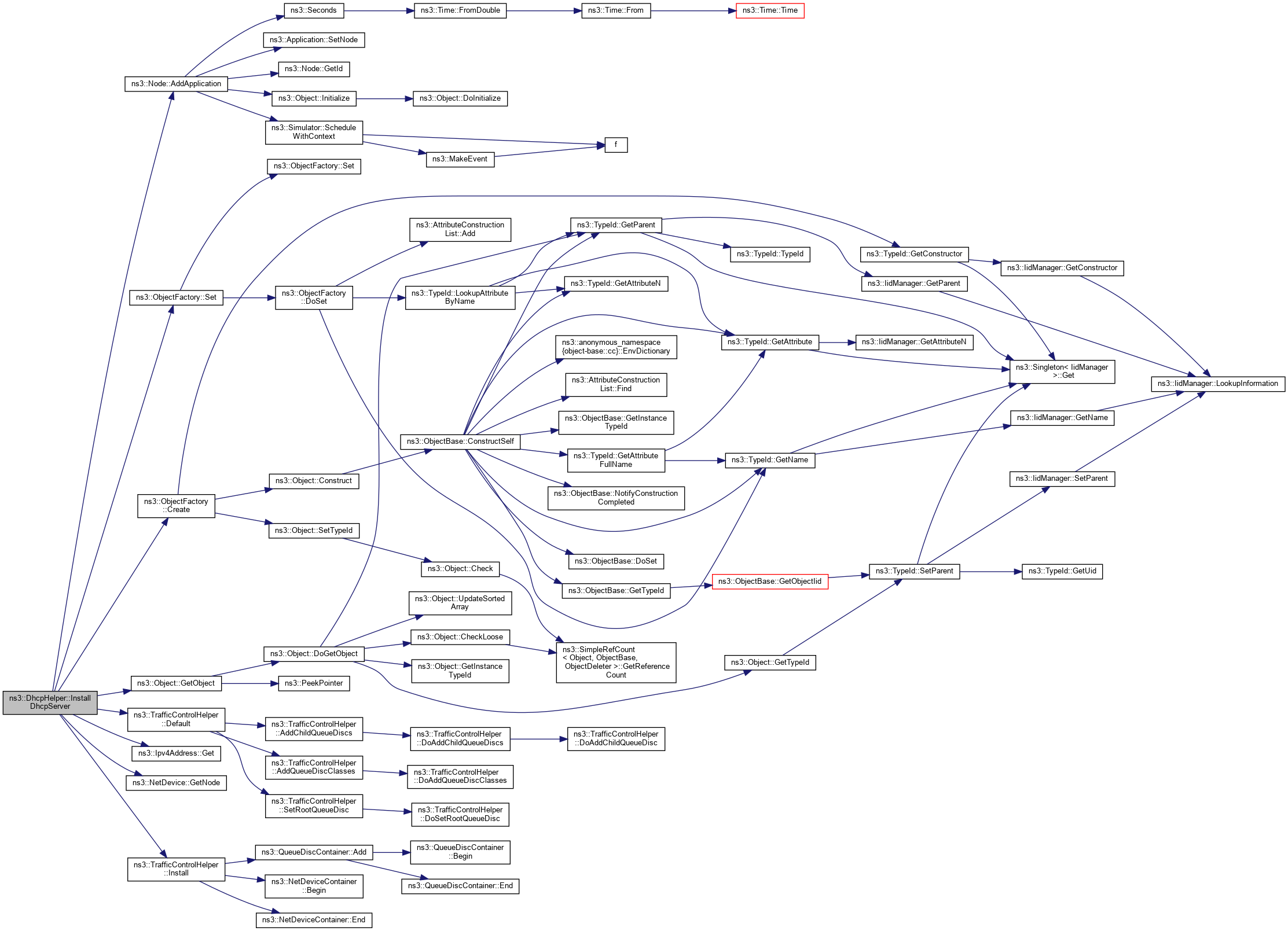 Here is the caller graph for this function:| ApplicationContainer ns3::DhcpHelper::InstallDhcpServer | ( | Ptr< NetDevice > | netDevice, |