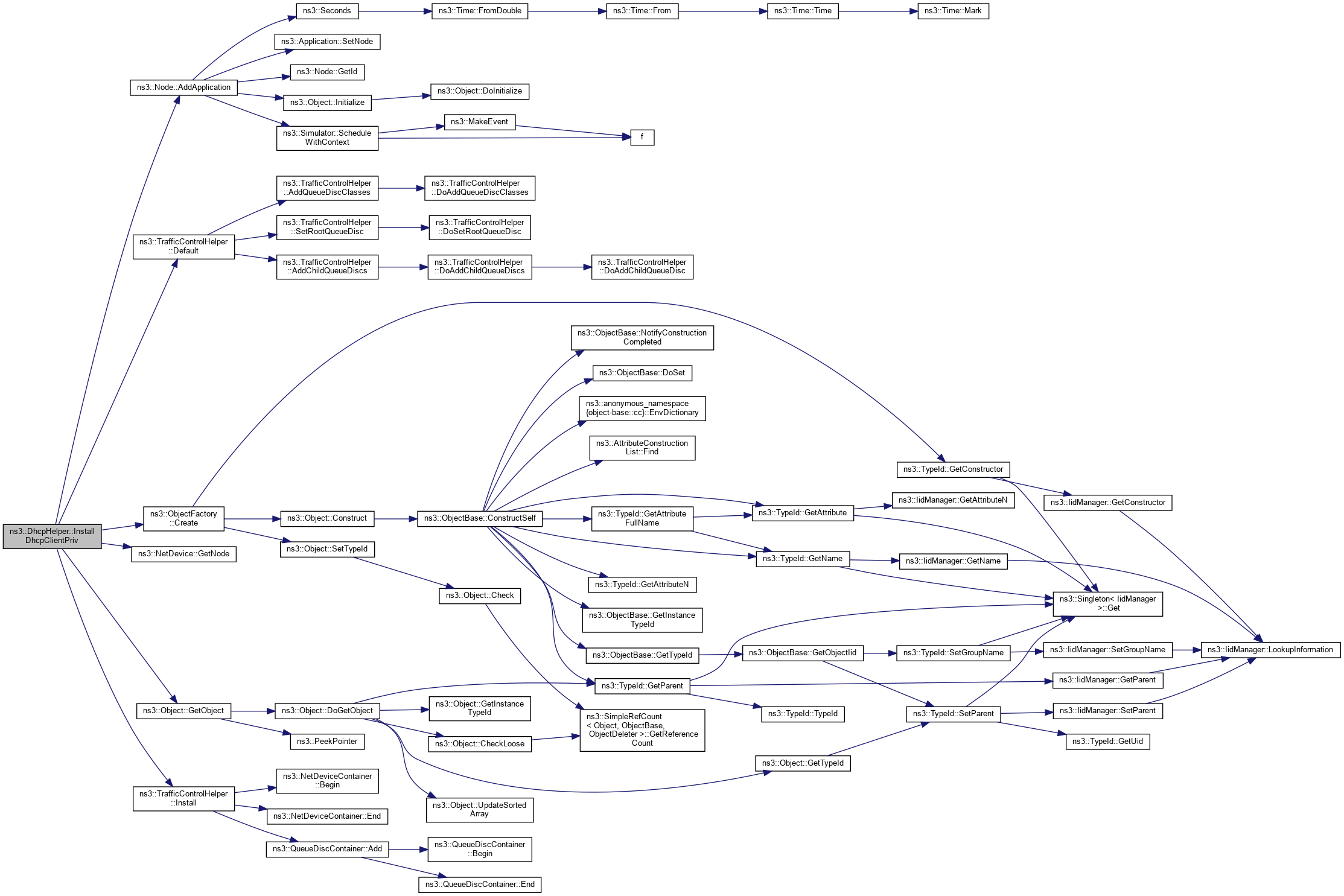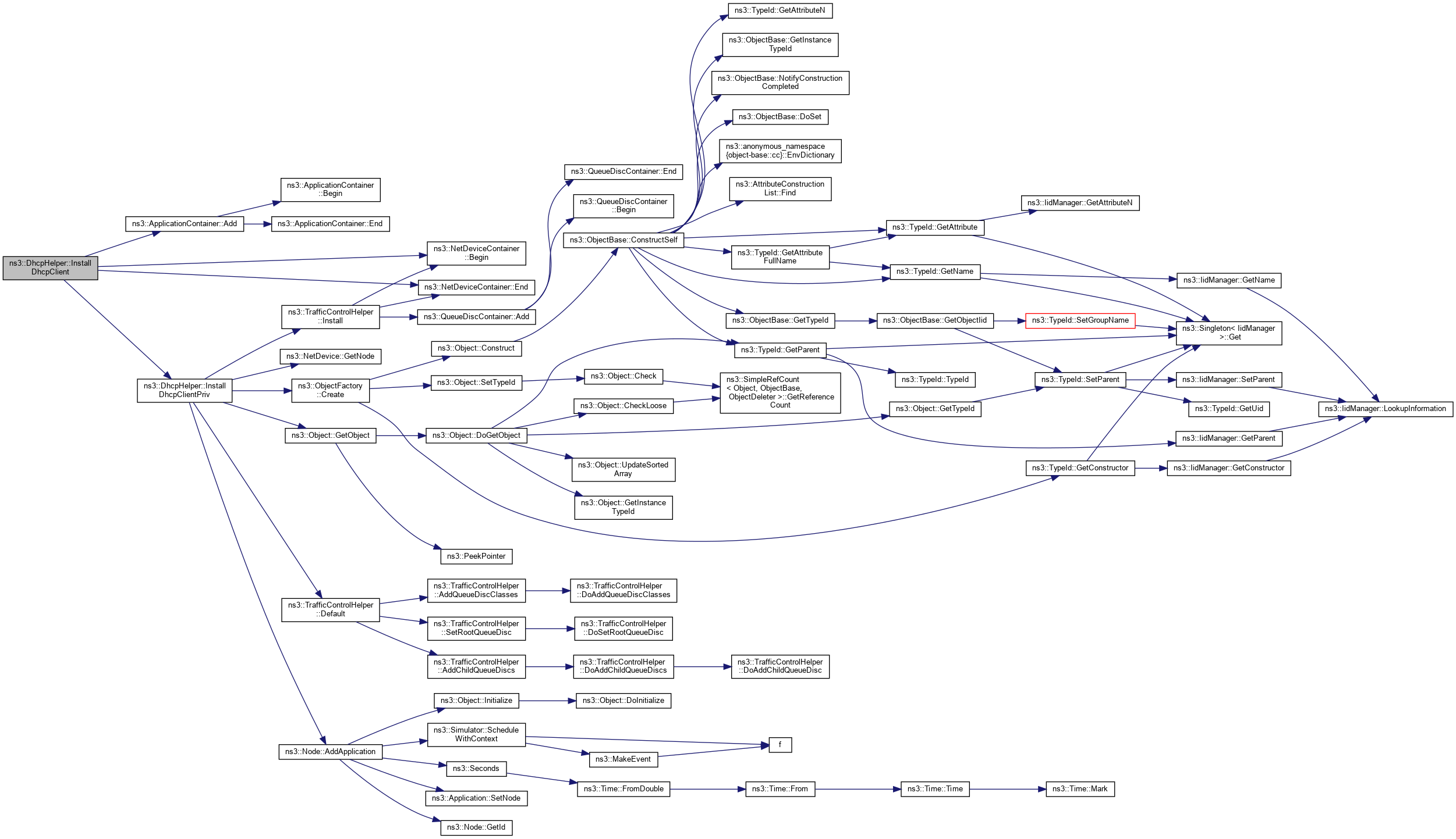 Here is the call graph for this function:| ApplicationContainer ns3::DhcpHelper::InstallDhcpClient | ( | NetDeviceContainer | netDevices | ) | const |