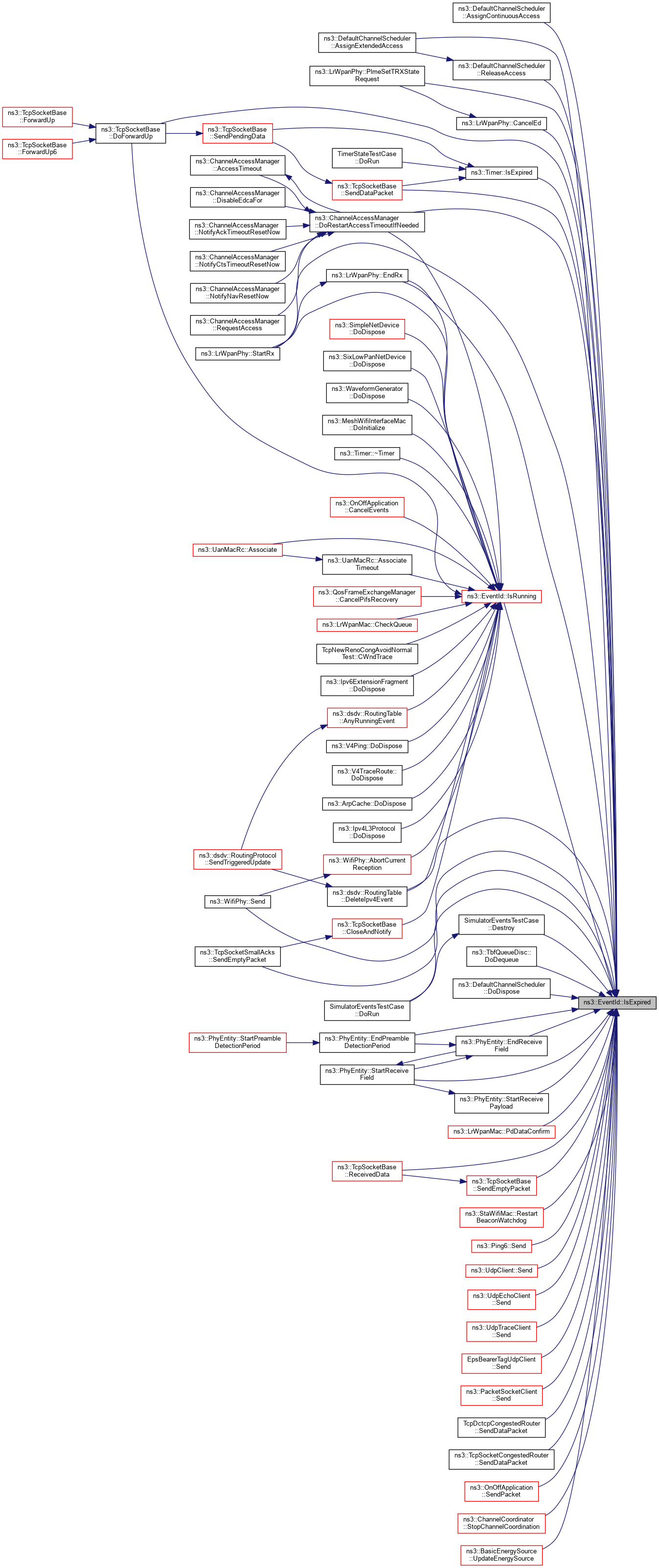 Referenced by ns3::DefaultChannelScheduler::AssignContinuousAccess(), ns3::DefaultChannelScheduler::AssignExtendedAccess(), ns3::LrWpanPhy::CancelEd(), ns3::dsdv::RoutingTable::DeleteIpv4Event(), SimulatorEventsTestCase::Destroy(), ns3::TbfQueueDisc::DoDequeue(), ns3::DefaultChannelScheduler::DoDispose(), ns3::TcpSocketBase::DoForwardUp(), ns3::ChannelAccessManager::DoRestartAccessTimeoutIfNeeded(), SimulatorEventsTestCase::DoRun(), ns3::PhyEntity::EndPreambleDetectionPeriod(), ns3::PhyEntity::EndReceiveField(), ns3::LrWpanPhy::EndRx(), ns3::Timer::IsExpired(), IsRunning(), ns3::LrWpanMac::PdDataConfirm(), ns3::LrWpanPhy::PlmeSetTRXStateRequest(), ns3::TcpSocketBase::ReceivedData(), ns3::DefaultChannelScheduler::ReleaseAccess(), ns3::StaWifiMac::RestartBeaconWatchdog(), ns3::Ping6::Send(), ns3::UdpClient::Send(), ns3::UdpEchoClient::Send(), ns3::UdpTraceClient::Send(), EpsBearerTagUdpClient::Send(), ns3::PacketSocketClient::Send(), ns3::WifiPhy::Send(), ns3::TcpSocketBase::SendDataPacket(), TcpDctcpCongestedRouter::SendDataPacket(), ns3::TcpSocketCongestedRouter::SendDataPacket(), ns3::TcpSocketBase::SendEmptyPacket(), ns3::TcpSocketSmallAcks::SendEmptyPacket(), ns3::OnOffApplication::SendPacket(), ns3::PhyEntity::StartReceiveField(), ns3::PhyEntity::StartReceivePayload(), ns3::LrWpanPhy::StartRx(), ns3::ChannelCoordinator::StopChannelCoordination(), and ns3::BasicEnergySource::UpdateEnergySource().