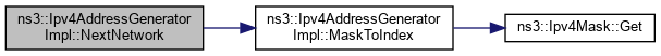 Here is the call graph for this function:| Ipv4Address ns3::Ipv4AddressGeneratorImpl::NextNetwork | ( | const Ipv4Mask | mask | ) |
