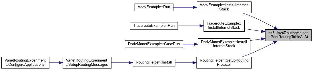 This method calls the PrintRoutingTable() method of the Ipv4RoutingProtocol stored in the Ipv4 object, for all nodes at the specified time; the output format is routing protocol-specific.