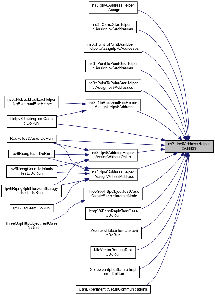 Referenced by Assign(), ns3::CsmaStarHelper::AssignIpv6Addresses(), ns3::PointToPointDumbbellHelper::AssignIpv6Addresses(), ns3::PointToPointGridHelper::AssignIpv6Addresses(), ns3::PointToPointStarHelper::AssignIpv6Addresses(), ns3::NoBackhaulEpcHelper::AssignUeIpv6Address(), AssignWithoutAddress(), AssignWithoutOnLink(), ThreeGppHttpObjectTestCase::CreateSimpleInternetNode(), RadvdTestCase::DoRun(), IcmpV6EchoReplyTestCase::DoRun(), IpAddressHelperTestCasev6::DoRun(), LteIpv6RoutingTestCase::DoRun(), NixVectorRoutingTest::DoRun(), SixlowpanIphcStatefulImplTest::DoRun(), and UanExperiment::SetupCommunications().