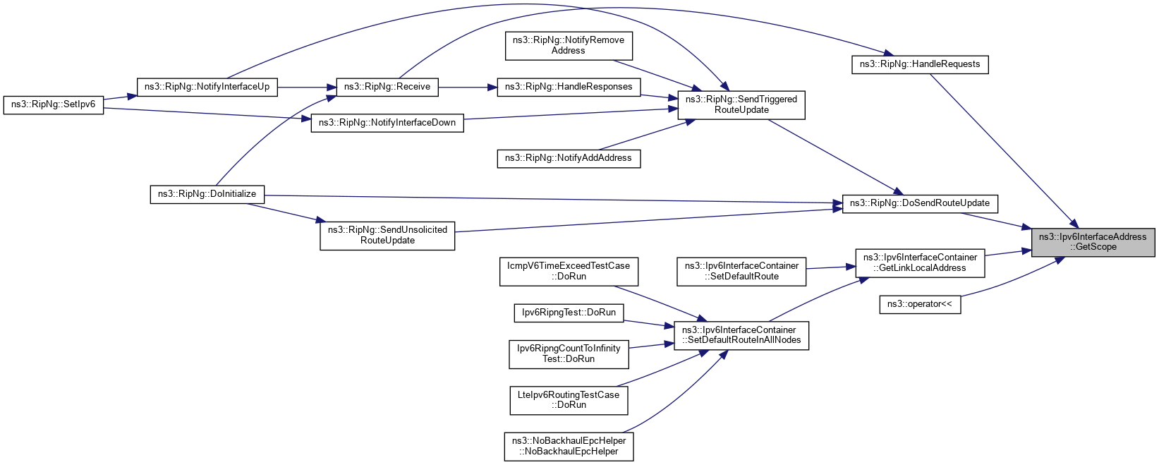 Here is the caller graph for this function:| Ipv6InterfaceAddress::Scope_e ns3::Ipv6InterfaceAddress::GetScope | ( | void | ) | const |
