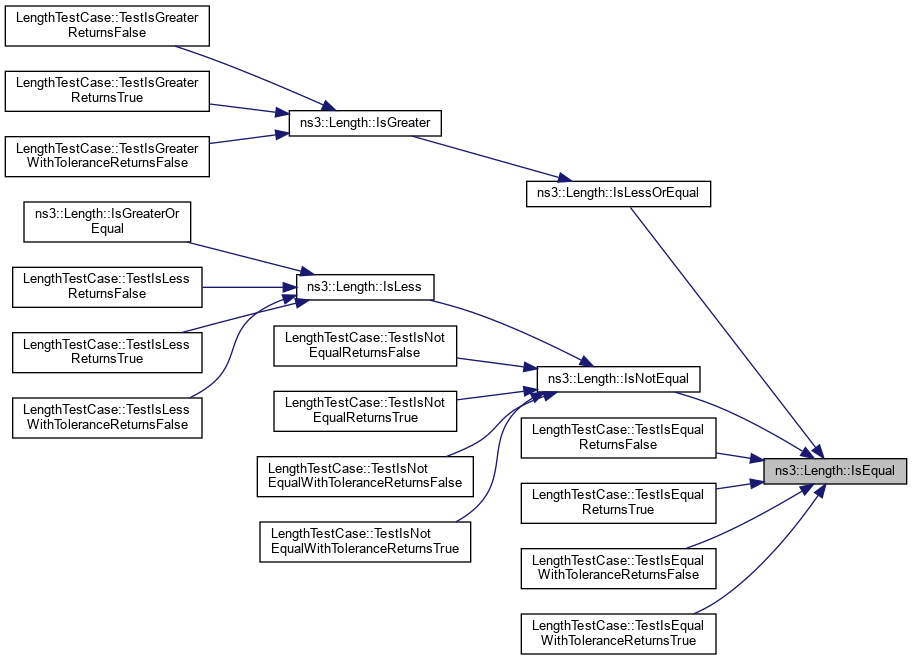 Referenced by IsLessOrEqual(), IsNotEqual(), LengthTestCase::TestIsEqualReturnsFalse(), LengthTestCase::TestIsEqualReturnsTrue(), LengthTestCase::TestIsEqualWithToleranceReturnsFalse(), and LengthTestCase::TestIsEqualWithToleranceReturnsTrue().