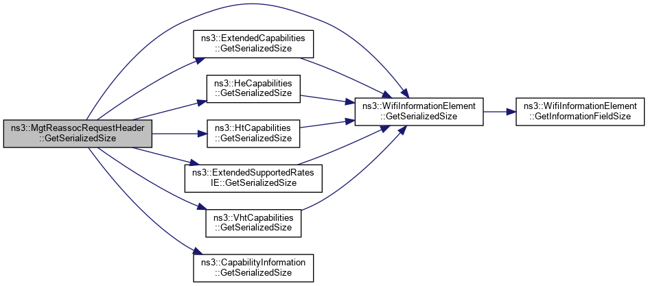 References ns3::SupportedRates::extended, ns3::WifiInformationElement::GetSerializedSize(), ns3::ExtendedCapabilities::GetSerializedSize(), ns3::HeCapabilities::GetSerializedSize(), ns3::HtCapabilities::GetSerializedSize(), ns3::ExtendedSupportedRatesIE::GetSerializedSize(), ns3::VhtCapabilities::GetSerializedSize(), ns3::CapabilityInformation::GetSerializedSize(), m_capability, m_extendedCapability, m_heCapability, m_htCapability, m_rates, m_ssid, and m_vhtCapability.