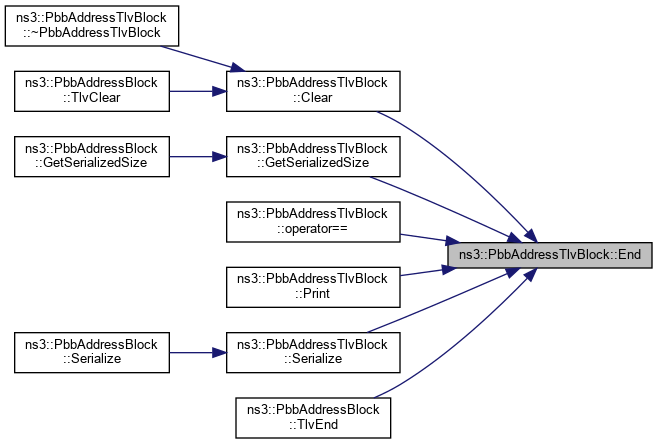 Here is the caller graph for this function:| PbbAddressTlvBlock::ConstIterator ns3::PbbAddressTlvBlock::End | ( | void | ) | const |