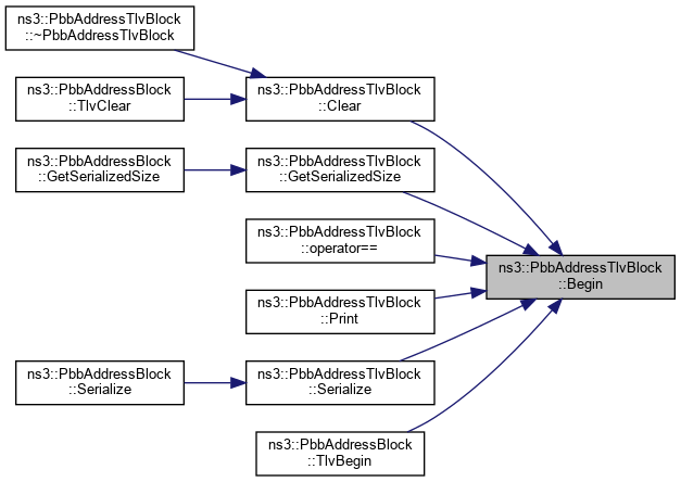 Here is the caller graph for this function:| PbbAddressTlvBlock::ConstIterator ns3::PbbAddressTlvBlock::Begin | ( | void | ) | const |