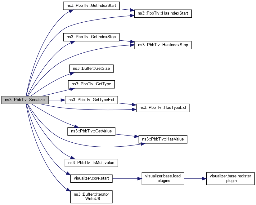 Here is the call graph for this function:| void ns3::PbbTlv::Serialize | ( | Buffer::Iterator & | start | ) | const |
