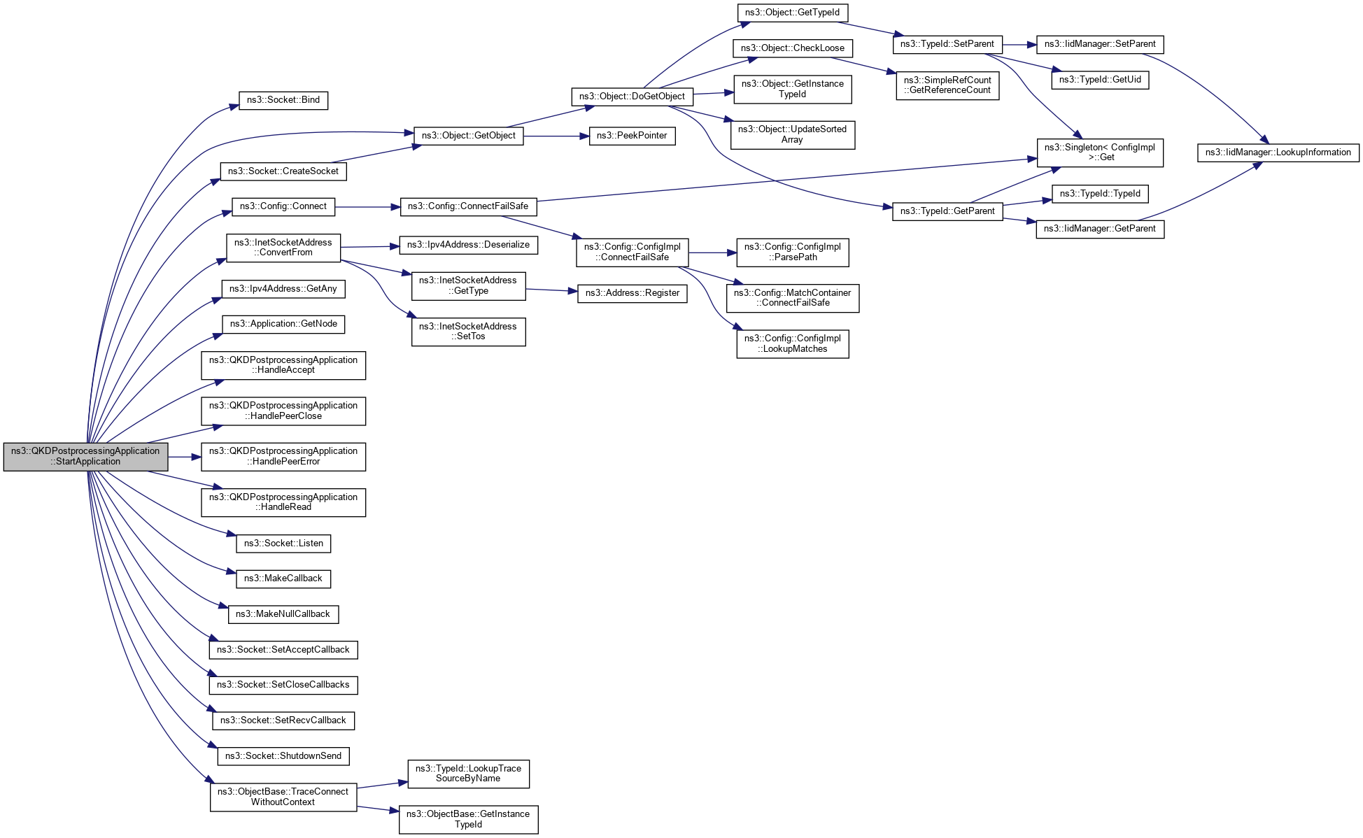 References ns3::Socket::Bind(), ns3::Config::Connect(), ns3::InetSocketAddress::ConvertFrom(), ns3::Socket::CreateSocket(), ns3::Ipv4Address::GetAny(), ns3::Application::GetNode(), ns3::Object::GetObject(), HandleAccept(), HandlePeerClose(), HandlePeerError(), HandleRead(), ns3::Socket::Listen(), m_keySizeInBits, m_local, m_sendSocket, m_sinkSocket, m_tid, ns3::MakeCallback(), ns3::MakeNullCallback(), NS_ASSERT, NS_FATAL_ERROR, NS_LOG_FUNCTION, ns3::Socket::SetAcceptCallback(), ns3::Socket::SetCloseCallbacks(), ns3::Socket::SetRecvCallback(), ns3::Socket::ShutdownSend(), and ns3::ObjectBase::TraceConnectWithoutContext().