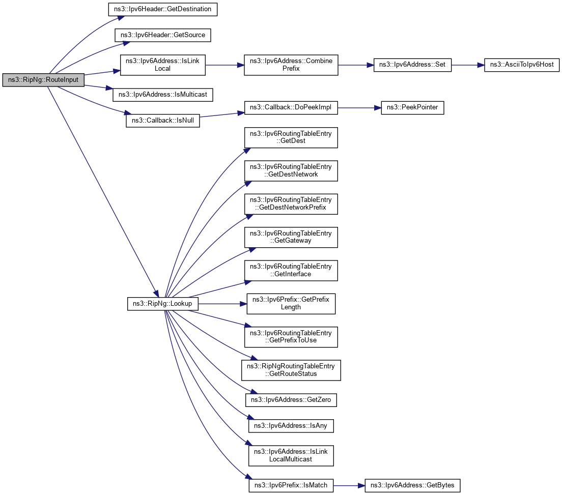 This lookup is used in the forwarding process. The packet is handed over to the Ipv6RoutingProtocol, and will get forwarded onward by one of the callbacks. The Linux equivalent is ip_route_input (). There are four valid outcomes, and a matching callbacks to handle each.