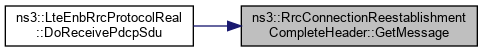 Here is the call graph for this function:| LteRrcSap::RrcConnectionReestablishmentComplete ns3::RrcConnectionReestablishmentCompleteHeader::GetMessage | ( | ) | const |
