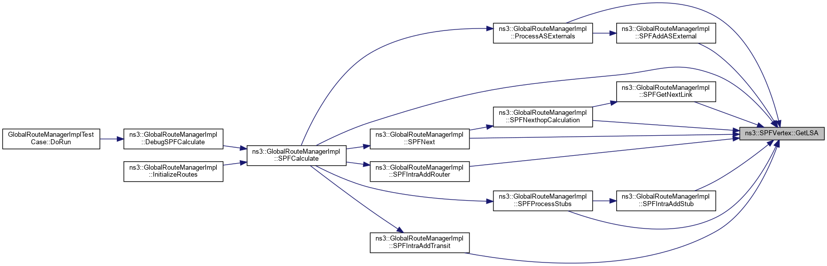 Each SPFVertex has a pointer to the Global Router Link State Advertisement (LSA) that its underlying router has exported. Within these LSAs are Global Router Link Records that describe the point to point links from the underlying router to other nodes (represented by other SPFVertex objects) in the simulation topology. The combination of the arrangement of the SPFVertex objects in the SPF tree, along with the details of the link records that connect them provide the information required to construct the required routes.