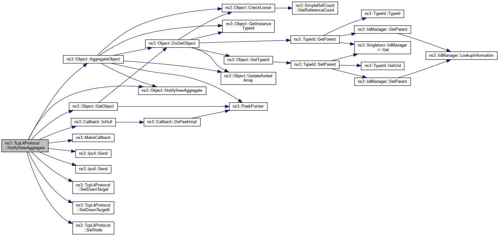 This function will notify other components connected to the node that a new stack member is now connected. This will be used to notify Layer 3 protocol of layer 4 protocol stack to connect them together. The aggregation is completed by setting the node in the TCP stack, link it to the ipv4 or ipv6 stack and adding TCP socket factory to the node.