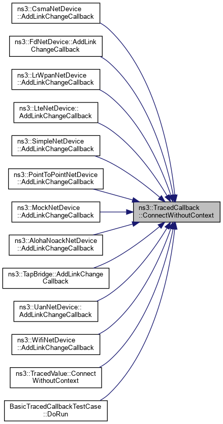 Referenced by ns3::CsmaNetDevice::AddLinkChangeCallback(), ns3::FdNetDevice::AddLinkChangeCallback(), ns3::LrWpanNetDevice::AddLinkChangeCallback(), ns3::LteNetDevice::AddLinkChangeCallback(), ns3::SimpleNetDevice::AddLinkChangeCallback(), ns3::PointToPointNetDevice::AddLinkChangeCallback(), ns3::MockNetDevice::AddLinkChangeCallback(), ns3::AlohaNoackNetDevice::AddLinkChangeCallback(), ns3::TapBridge::AddLinkChangeCallback(), ns3::UanNetDevice::AddLinkChangeCallback(), ns3::WifiNetDevice::AddLinkChangeCallback(), ns3::TracedValue< T >::ConnectWithoutContext(), and BasicTracedCallbackTestCase::DoRun().