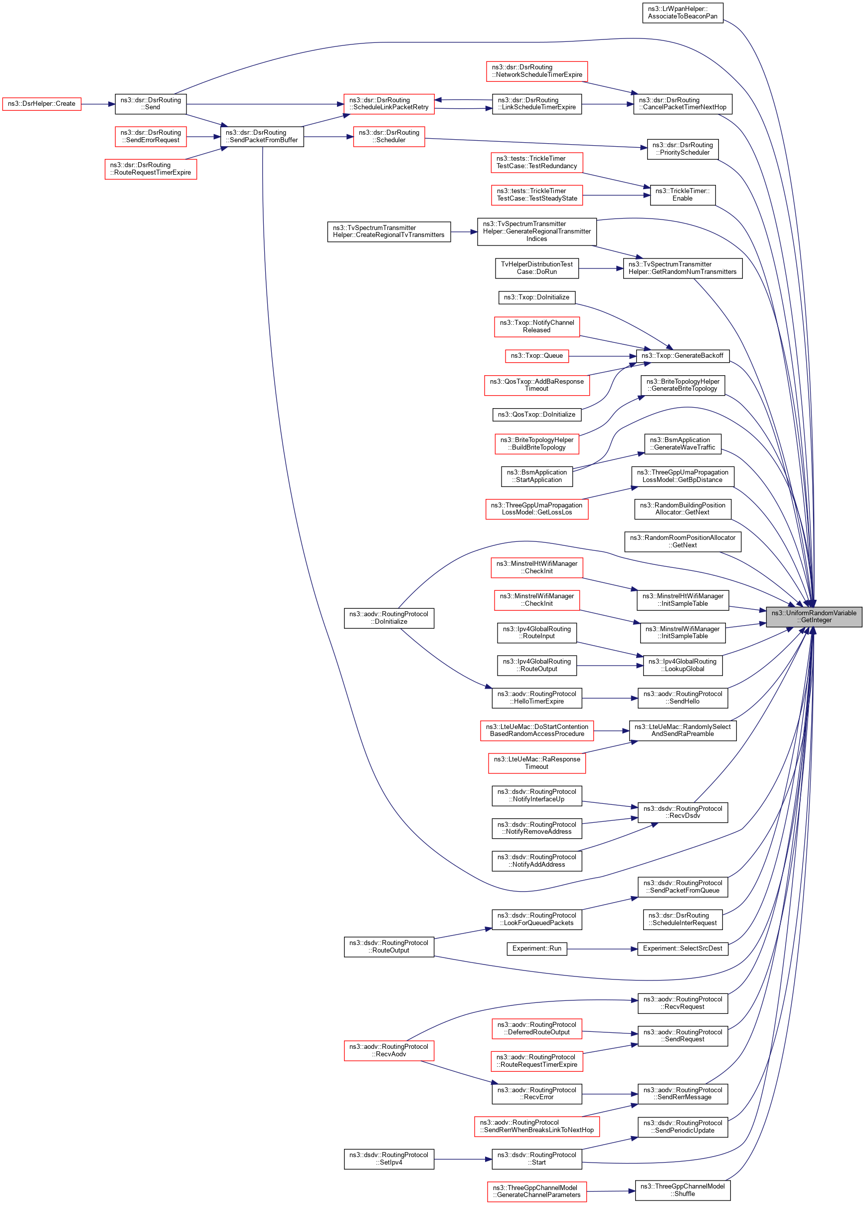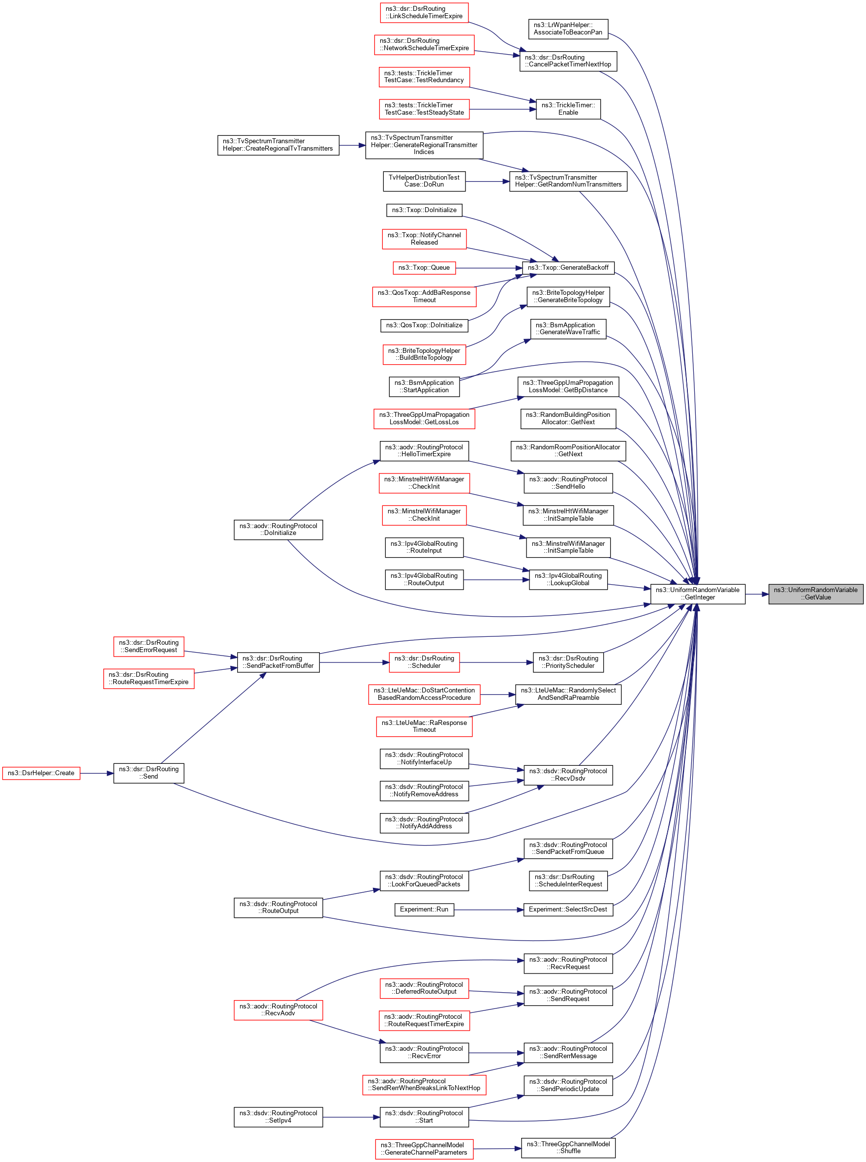 Referenced by ns3::LrWpanHelper::AssociateToBeaconPan(), ns3::dsr::DsrRouting::CancelPacketTimerNextHop(), ns3::aodv::RoutingProtocol::DoInitialize(), ns3::TrickleTimer::Enable(), ns3::Txop::GenerateBackoff(), ns3::BriteTopologyHelper::GenerateBriteTopology(), ns3::TvSpectrumTransmitterHelper::GenerateRegionalTransmitterIndices(), ns3::BsmApplication::GenerateWaveTraffic(), ns3::ThreeGppUmaPropagationLossModel::GetBpDistance(), ns3::RandomBuildingPositionAllocator::GetNext(), ns3::RandomRoomPositionAllocator::GetNext(), ns3::TvSpectrumTransmitterHelper::GetRandomNumTransmitters(), ns3::MinstrelHtWifiManager::InitSampleTable(), ns3::MinstrelWifiManager::InitSampleTable(), ns3::Ipv4GlobalRouting::LookupGlobal(), ns3::dsr::DsrRouting::PriorityScheduler(), ns3::LteUeMac::RandomlySelectAndSendRaPreamble(), ns3::dsdv::RoutingProtocol::RecvDsdv(), ns3::aodv::RoutingProtocol::RecvRequest(), ns3::dsdv::RoutingProtocol::RouteOutput(), ns3::dsr::DsrRouting::ScheduleInterRequest(), Experiment::SelectSrcDest(), ns3::dsr::DsrRouting::Send(), ns3::aodv::RoutingProtocol::SendHello(), ns3::dsr::DsrRouting::SendPacketFromBuffer(), ns3::dsdv::RoutingProtocol::SendPacketFromQueue(), ns3::dsdv::RoutingProtocol::SendPeriodicUpdate(), ns3::aodv::RoutingProtocol::SendRequest(), ns3::aodv::RoutingProtocol::SendRerrMessage(), ns3::ThreeGppChannelModel::Shuffle(), ns3::dsdv::RoutingProtocol::Start(), and ns3::BsmApplication::StartApplication().
