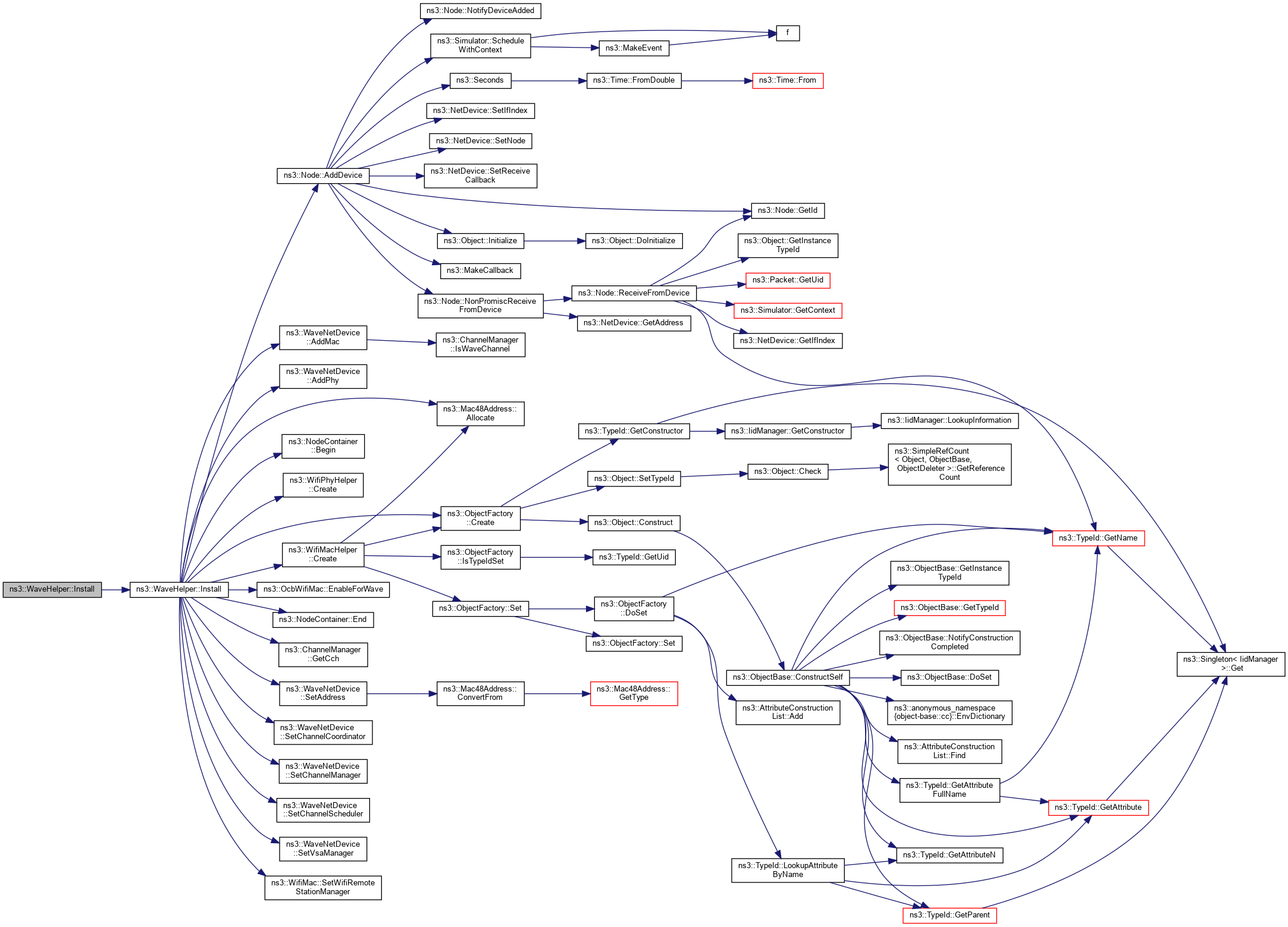| virtual NetDeviceContainer | Install (const WifiPhyHelper &phy, const WifiMacHelper &mac, Ptr< Node > node) const |