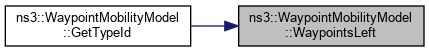 Here is the caller graph for this function:| uint32_t ns3::WaypointMobilityModel::WaypointsLeft | ( | void | ) | const |