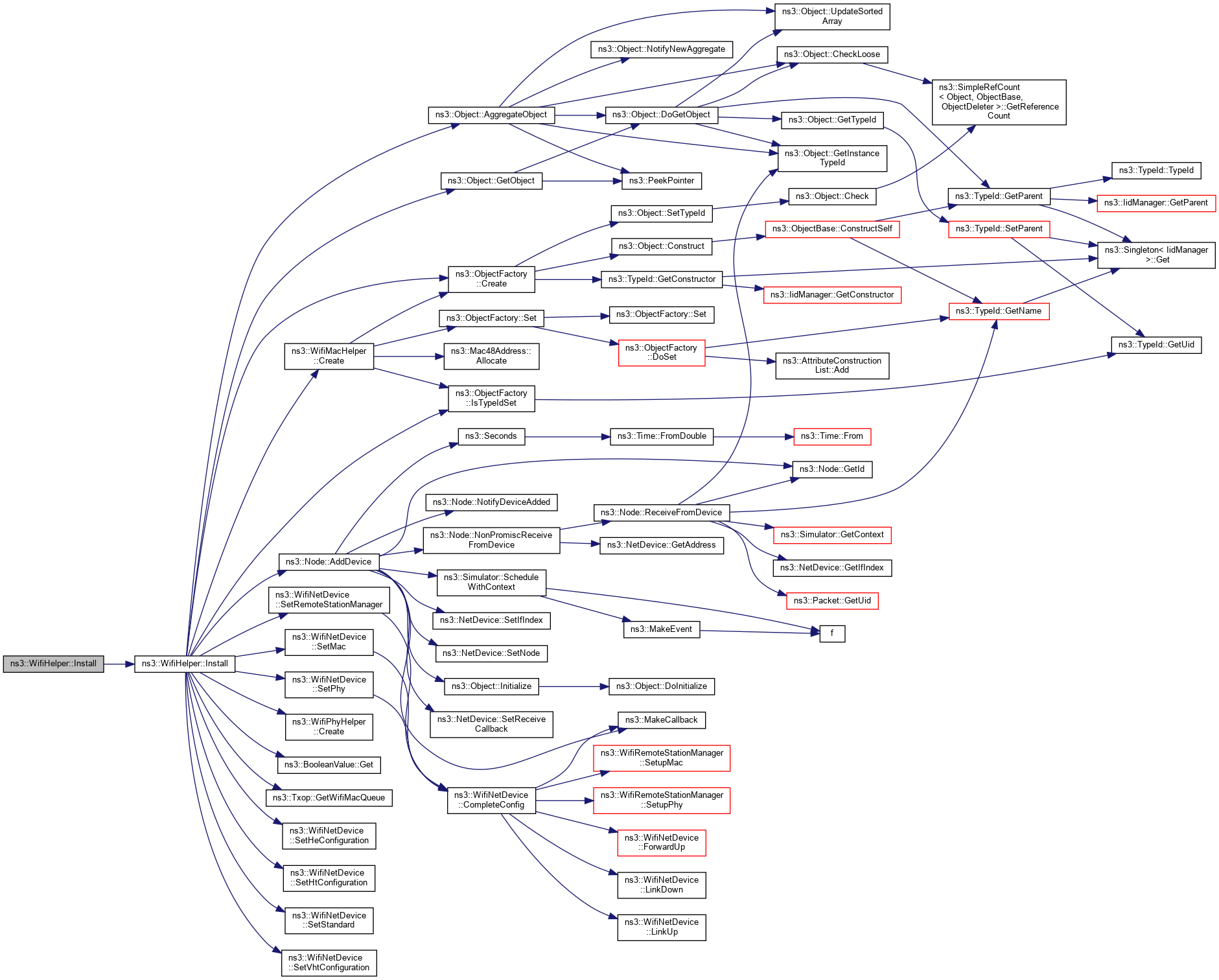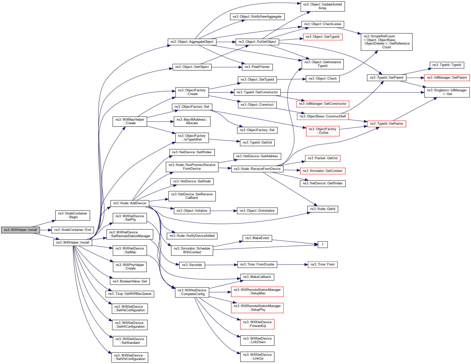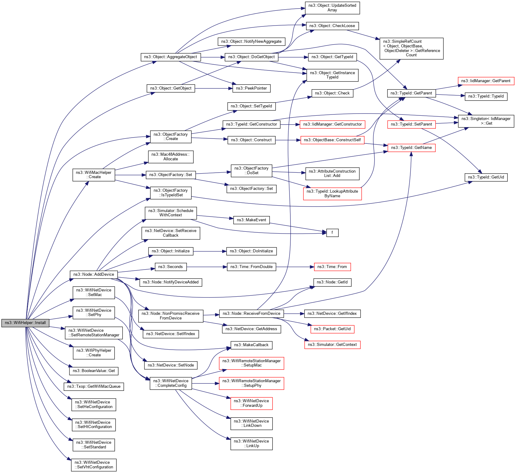 | virtual NetDeviceContainer | Install (const WifiPhyHelper &phy, const WifiMacHelper &mac, Ptr< Node > node) const |