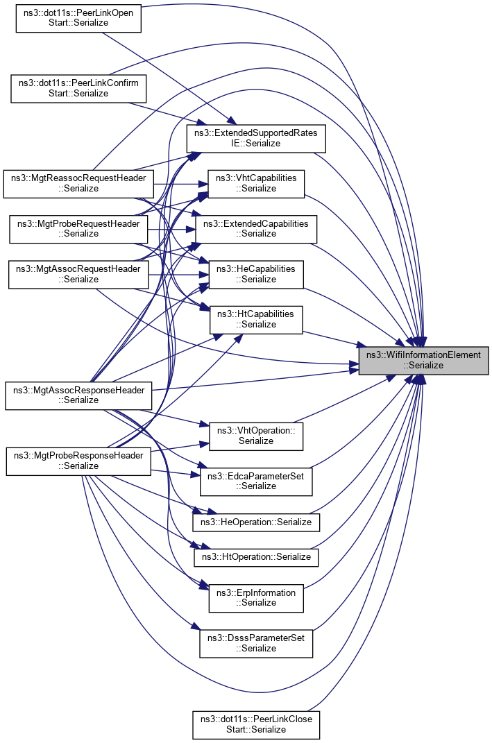 Referenced by ns3::dot11s::PeerLinkOpenStart::Serialize(), ns3::dot11s::PeerLinkCloseStart::Serialize(), ns3::dot11s::PeerLinkConfirmStart::Serialize(), ns3::MgtReassocRequestHeader::Serialize(), ns3::MgtAssocResponseHeader::Serialize(), ns3::MgtProbeRequestHeader::Serialize(), ns3::MgtProbeResponseHeader::Serialize(), ns3::EdcaParameterSet::Serialize(), ns3::ExtendedCapabilities::Serialize(), ns3::HeCapabilities::Serialize(), ns3::HeOperation::Serialize(), ns3::HtCapabilities::Serialize(), ns3::HtOperation::Serialize(), ns3::MgtAssocRequestHeader::Serialize(), ns3::DsssParameterSet::Serialize(), ns3::ErpInformation::Serialize(), ns3::ExtendedSupportedRatesIE::Serialize(), ns3::VhtCapabilities::Serialize(), and ns3::VhtOperation::Serialize().