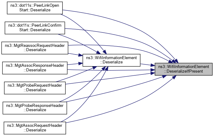 Here is the caller graph for this function:| Buffer::Iterator ns3::WifiInformationElement::DeserializeIfPresent | ( | Buffer::Iterator | i | ) |