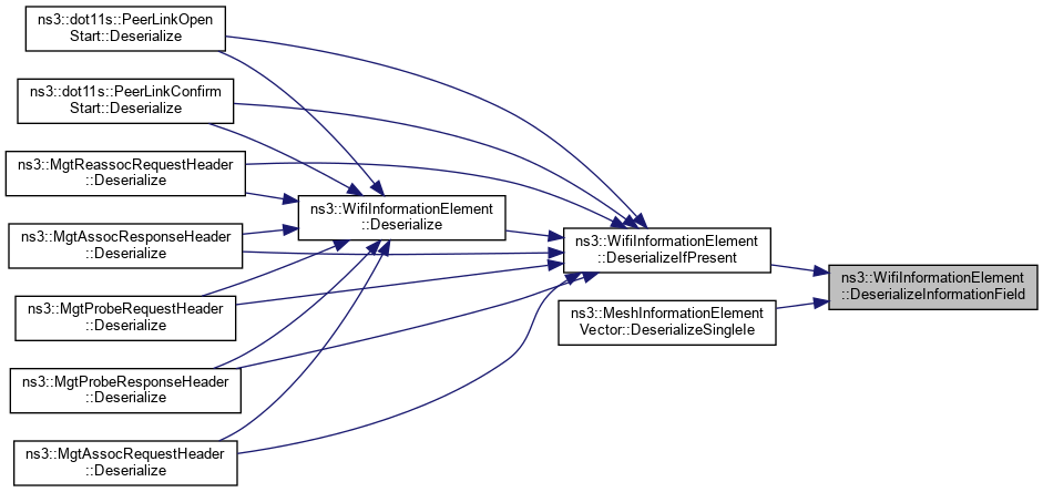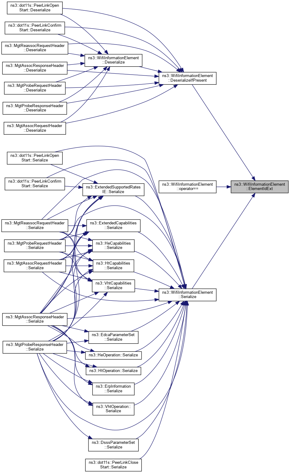 Implemented in ns3::VhtOperation, ns3::VhtCapabilities, ns3::ExtendedSupportedRatesIE, ns3::Ssid, ns3::ErpInformation, ns3::DsssParameterSet, ns3::HtOperation, ns3::HtCapabilities, ns3::HeOperation, ns3::HeCapabilities, ns3::ExtendedCapabilities, ns3::EdcaParameterSet, ns3::SupportedRates, ns3::MuEdcaParameterSet, ns3::dot11s::IeRann, ns3::dot11s::IePrep, ns3::dot11s::IePerr, ns3::dot11s::IeLinkMetricReport, ns3::dot11s::IeMeshId, ns3::dot11s::IePreq, ns3::dot11s::IePeeringProtocol, ns3::dot11s::IePeerManagement, ns3::dot11s::IeConfiguration, and ns3::dot11s::IeBeaconTiming.