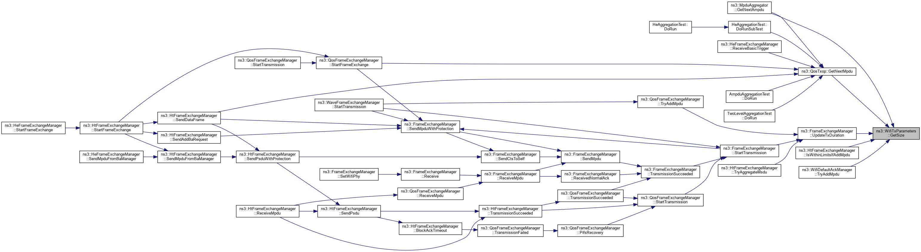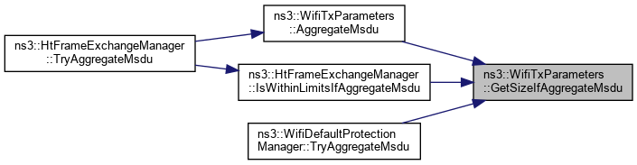Referenced by WifiTxParameters(), Clear(), ns3::RrMultiUserScheduler::ComputeDlMuInfo(), AmpduAggregationTest::DoRun(), TwoLevelAggregationTest::DoRun(), HeAggregationTest::DoRunSubTest(), ns3::WifiDefaultAckManager::GetAckInfoIfAggregatedMuBar(), ns3::WifiDefaultAckManager::GetAckInfoIfBarBaSequence(), ns3::WifiDefaultAckManager::GetAckInfoIfTfMuBar(), ns3::FrameExchangeManager::GetFrameDurationId(), ns3::QosFrameExchangeManager::GetFrameDurationId(), ns3::MpduAggregator::GetNextAmpdu(), ns3::MsduAggregator::GetNextAmsdu(), GetSize(), GetSizeIfAddMpdu(), GetSizeIfAggregateMsdu(), ns3::FrameExchangeManager::GetTxDuration(), ns3::HeFrameExchangeManager::GetTxDuration(), ns3::HtFrameExchangeManager::IsWithinLimitsIfAddMpdu(), ns3::HtFrameExchangeManager::IsWithinLimitsIfAggregateMsdu(), ns3::QosFrameExchangeManager::IsWithinSizeAndTimeLimits(), operator=(), Print(), ns3::HeFrameExchangeManager::ReceiveBasicTrigger(), ns3::FrameExchangeManager::ReceiveMpdu(), ns3::HtFrameExchangeManager::ReceiveMpdu(), TestMultiUserScheduler::SelectTxFormat(), ns3::HtFrameExchangeManager::SendAddBaRequest(), ns3::HtFrameExchangeManager::SendDataFrame(), ns3::FrameExchangeManager::SendMpdu(), ns3::HtFrameExchangeManager::SendMpduFromBaManager(), ns3::HtFrameExchangeManager::SendPsdu(), ns3::HeFrameExchangeManager::SendQosNullFramesInTbPpdu(), ns3::QosFrameExchangeManager::StartFrameExchange(), ns3::WaveFrameExchangeManager::StartTransmission(), ns3::FrameExchangeManager::StartTransmission(), ns3::WifiDefaultAckManager::TryAddMpdu(), ns3::WifiDefaultProtectionManager::TryAddMpdu(), ns3::WifiDefaultProtectionManager::TryAggregateMsdu(), ns3::RrMultiUserScheduler::TrySendingBasicTf(), ns3::RrMultiUserScheduler::TrySendingBsrpTf(), and ns3::RrMultiUserScheduler::TrySendingDlMuPpdu().