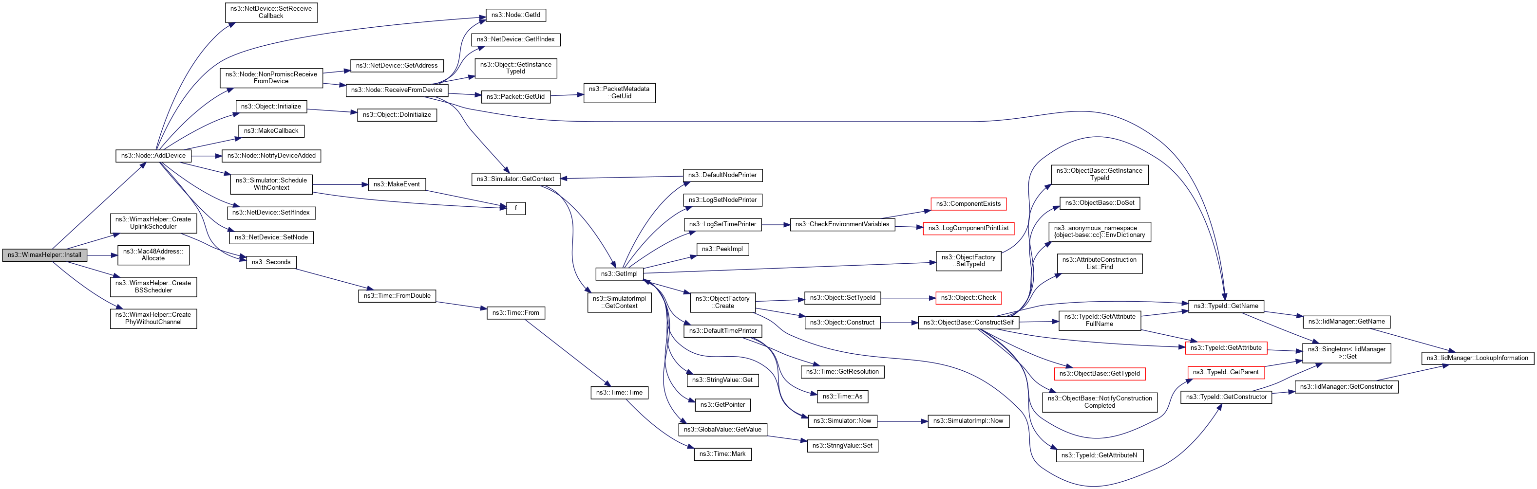 Here is the call graph for this function:| NetDeviceContainer ns3::WimaxHelper::Install | ( | NodeContainer | c, |
