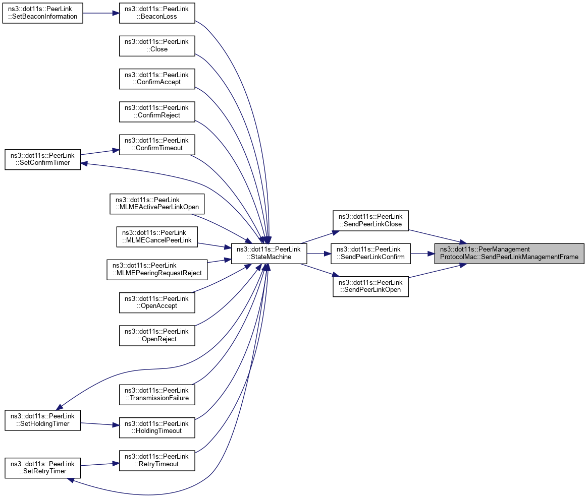 References ns3::Packet::AddHeader(), ns3::WifiInformationElementVector::AddInformationElement(), ns3::dot11s::PeerLinkConfirmStart::PlinkConfirmStartFields::aid, ns3::dot11s::PeerLinkOpenStart::PlinkOpenStartFields::capability, ns3::dot11s::PeerLinkConfirmStart::PlinkConfirmStartFields::capability, ns3::dot11s::PeerLinkOpenStart::PlinkOpenStartFields::config, ns3::dot11s::PeerLinkConfirmStart::PlinkConfirmStartFields::config, ns3::Packet::GetSize(), m_parent, m_protocol, m_stats, ns3::dot11s::PeerLinkOpenStart::PlinkOpenStartFields::meshId, ns3::dot11s::PeerLinkCloseStart::PlinkCloseStartFields::meshId, NS_LOG_FUNCTION, ns3::WifiActionHeader::PEER_LINK_CLOSE, ns3::WifiActionHeader::PEER_LINK_CONFIRM, ns3::WifiActionHeader::PEER_LINK_OPEN, ns3::dot11s::PeerLinkOpenStart::PlinkOpenStartFields::rates, ns3::dot11s::PeerLinkConfirmStart::PlinkConfirmStartFields::rates, ns3::WifiActionHeader::SELF_PROTECTED, ns3::WifiActionHeader::ActionValue::selfProtectedAction, ns3::WifiActionHeader::SetAction(), ns3::WifiMacHeader::SetAddr1(), ns3::WifiMacHeader::SetAddr2(), ns3::WifiMacHeader::SetAddr3(), ns3::WifiMacHeader::SetDsNotFrom(), ns3::WifiMacHeader::SetDsNotTo(), ns3::dot11s::IeConfiguration::SetNeighborCount(), ns3::dot11s::PeerLinkCloseStart::SetPlinkCloseStart(), ns3::dot11s::PeerLinkConfirmStart::SetPlinkConfirmStart(), ns3::dot11s::PeerLinkOpenStart::SetPlinkOpenStart(), ns3::WifiMacHeader::SetType(), ns3::dot11s::IePeerManagement::SubtypeIsClose(), ns3::dot11s::IePeerManagement::SubtypeIsConfirm(), ns3::dot11s::IePeerManagement::SubtypeIsOpen(), ns3::dot11s::PeerManagementProtocolMac::Statistics::txClose, ns3::dot11s::PeerManagementProtocolMac::Statistics::txConfirm, ns3::dot11s::PeerManagementProtocolMac::Statistics::txMgt, ns3::dot11s::PeerManagementProtocolMac::Statistics::txMgtBytes, ns3::dot11s::PeerManagementProtocolMac::Statistics::txOpen, and ns3::WIFI_MAC_MGT_ACTION.