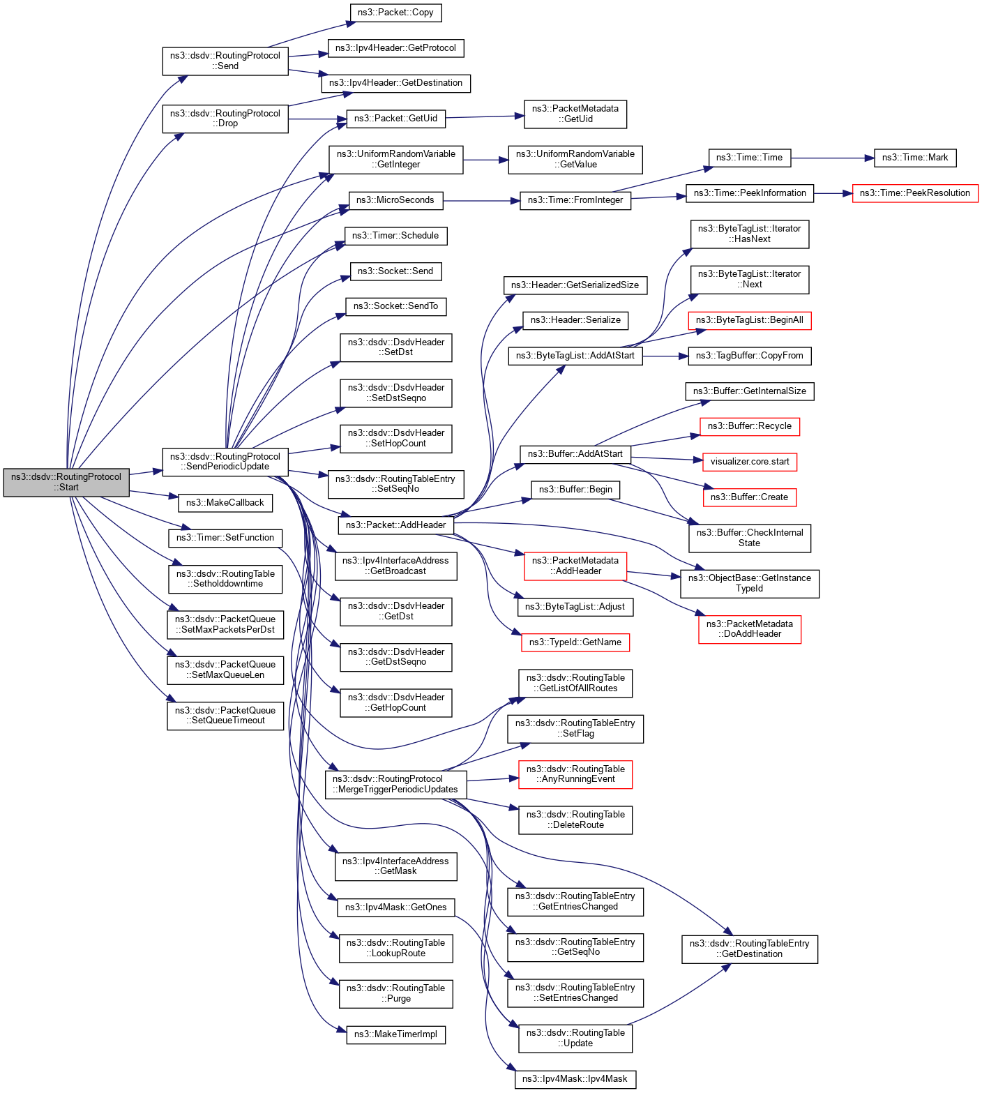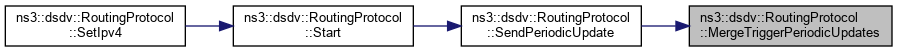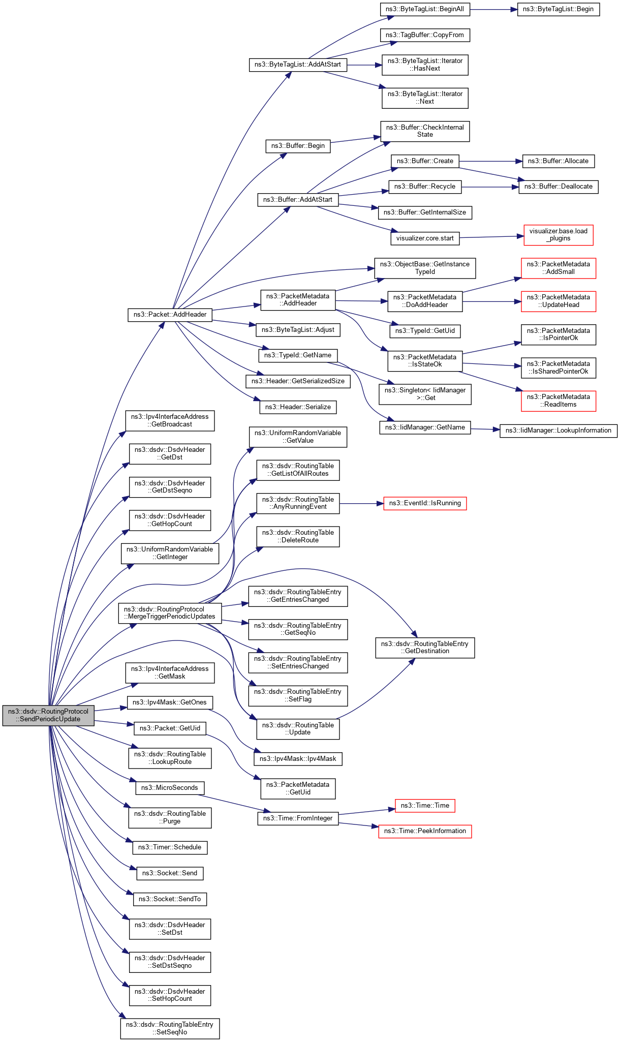 References ns3::Packet::AddHeader(), DSDV_PORT, ns3::Ipv4InterfaceAddress::GetBroadcast(), ns3::dsdv::DsdvHeader::GetDst(), ns3::dsdv::DsdvHeader::GetDstSeqno(), ns3::dsdv::DsdvHeader::GetHopCount(), ns3::UniformRandomVariable::GetInteger(), ns3::dsdv::RoutingTable::GetListOfAllRoutes(), ns3::Ipv4InterfaceAddress::GetMask(), ns3::Ipv4Mask::GetOnes(), ns3::Packet::GetUid(), ns3::dsdv::RoutingTable::LookupRoute(), m_ipv4, m_mainAddress, m_periodicUpdateInterval, m_periodicUpdateTimer, m_routingTable, m_socketAddresses, m_uniformRandomVariable, MergeTriggerPeriodicUpdates(), ns3::MicroSeconds(), NS_LOG_DEBUG, NS_LOG_FUNCTION, ns3::dsdv::RoutingTable::Purge(), ns3::Time::S, ns3::Timer::Schedule(), ns3::Socket::Send(), ns3::Socket::SendTo(), ns3::dsdv::DsdvHeader::SetDst(), ns3::dsdv::DsdvHeader::SetDstSeqno(), ns3::dsdv::DsdvHeader::SetHopCount(), ns3::dsdv::RoutingTableEntry::SetSeqNo(), and ns3::dsdv::RoutingTable::Update().