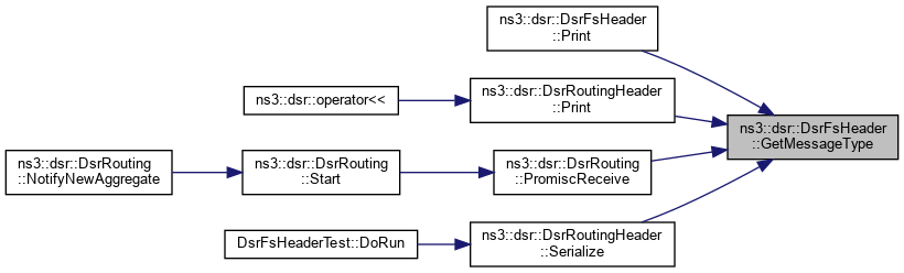 Here is the call graph for this function:| uint8_t ns3::dsr::DsrFsHeader::GetMessageType | ( | ) | const |