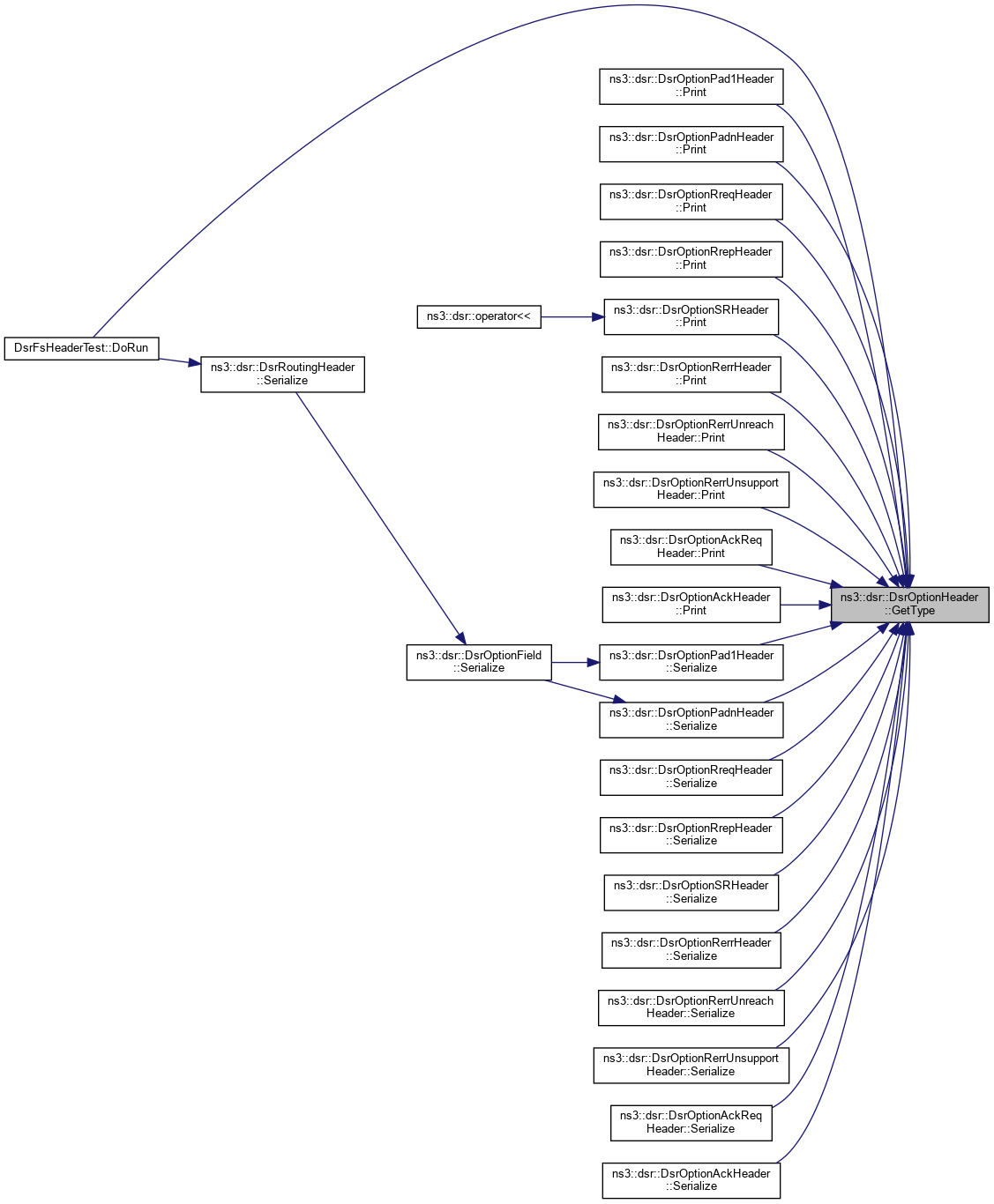 Here is the caller graph for this function:| uint8_t ns3::dsr::DsrOptionHeader::GetType | ( | ) | const |