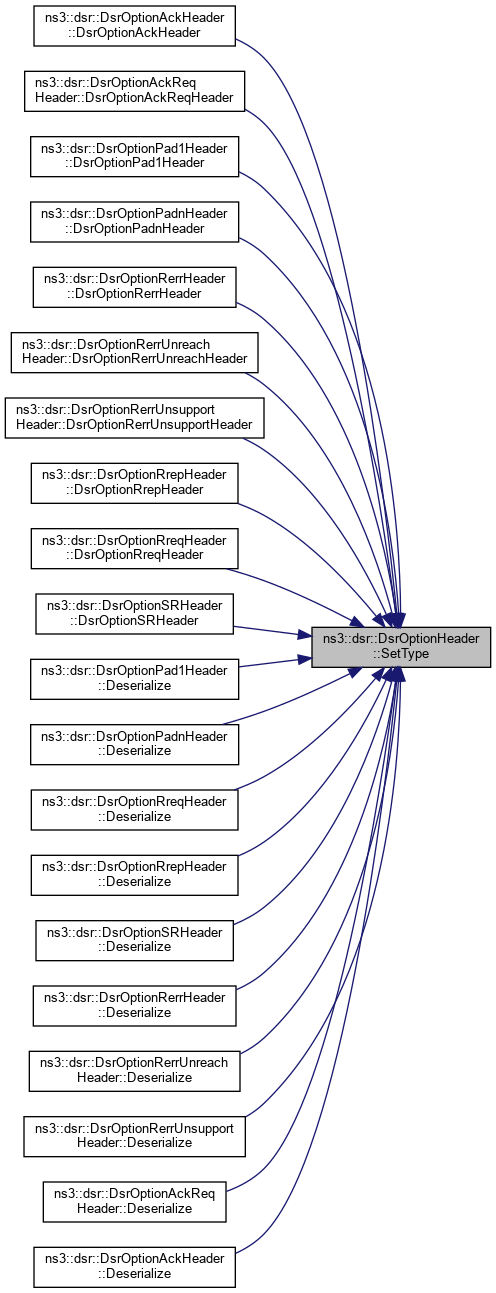 Here is the caller graph for this function:| void ns3::dsr::DsrOptionHeader::SetType | ( | uint8_t | type | ) |