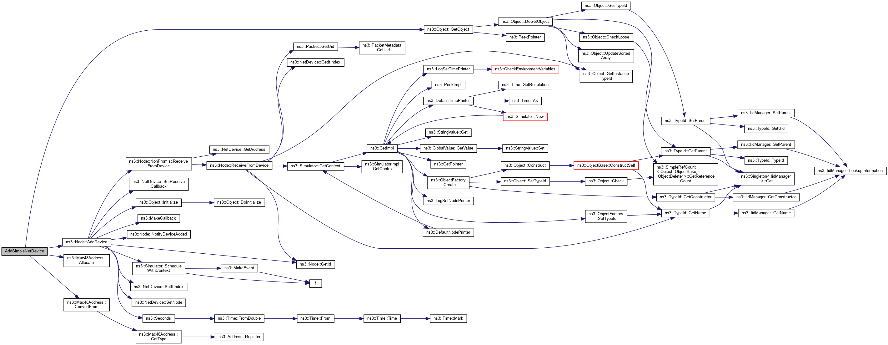 References ns3::Node::AddDevice(), ns3::Mac48Address::Allocate(), ns3::Mac48Address::ConvertFrom(), and ns3::Object::GetObject().