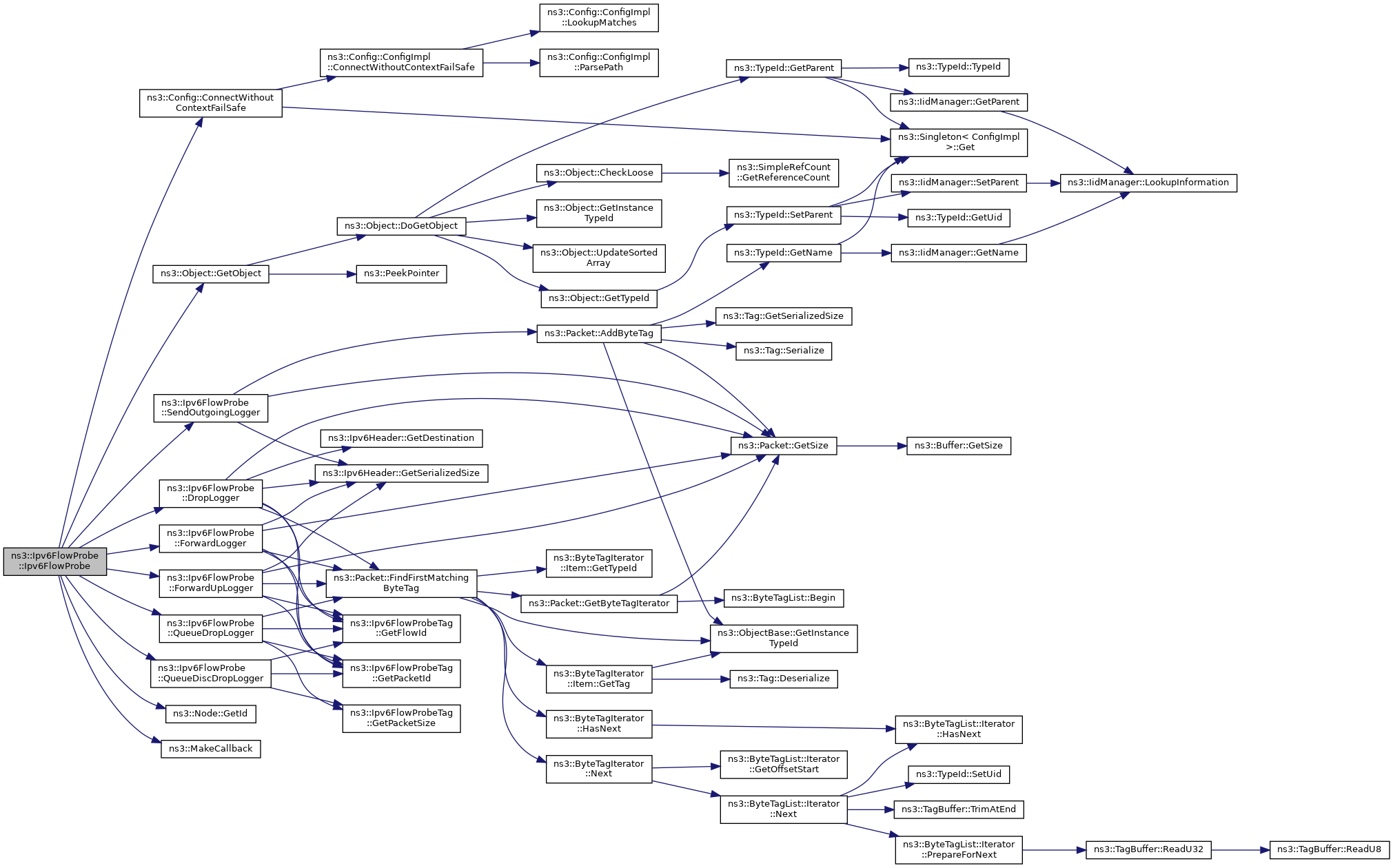 For each node in the simulation, one instance of the class Ipv4FlowProbe is created to monitor that node. Ipv4FlowProbe accomplishes this by connecting callbacks to trace sources in the Ipv6L3Protocol interface of the node.