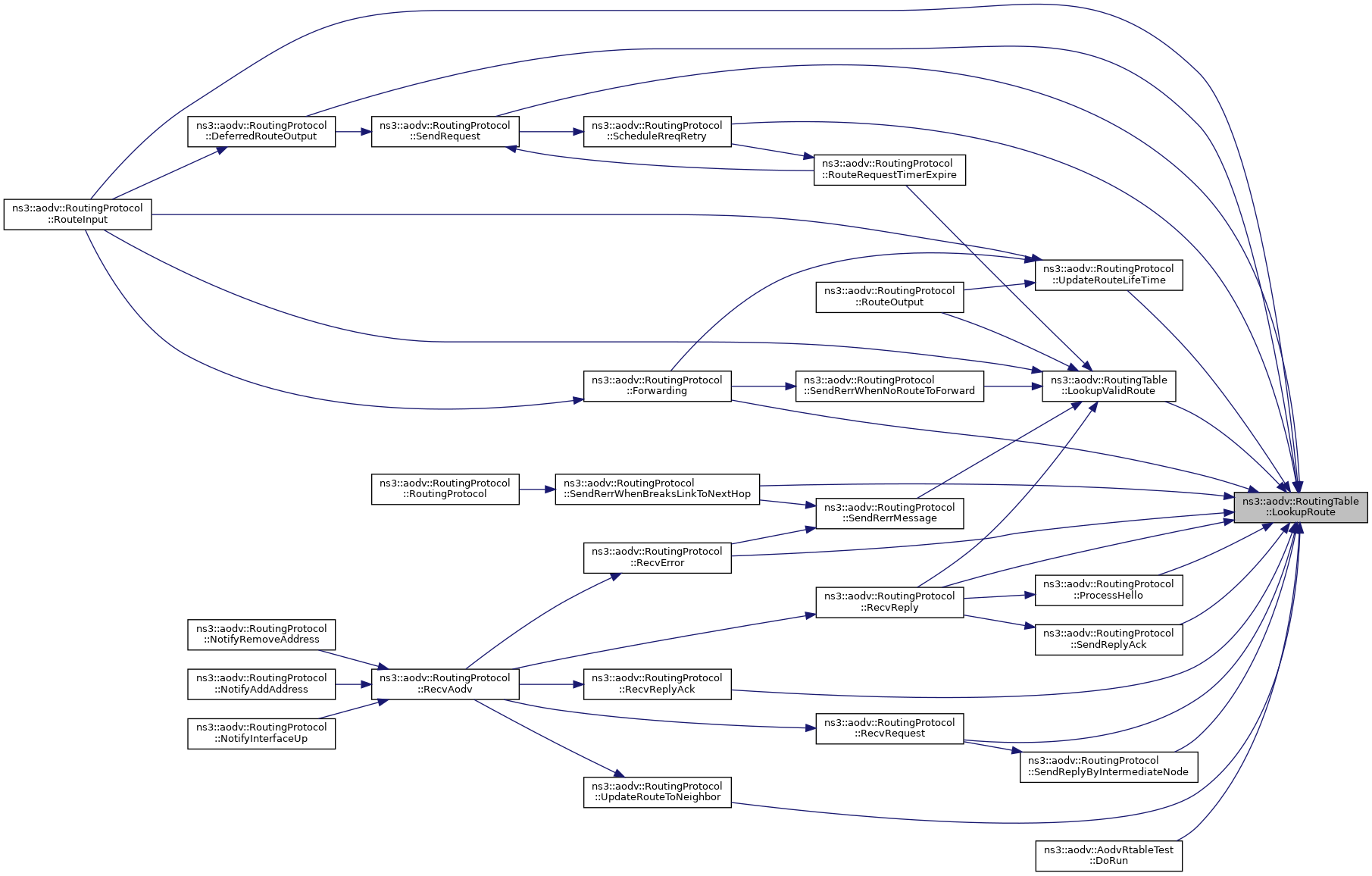 Referenced by ns3::aodv::RoutingProtocol::DeferredRouteOutput(), ns3::aodv::AodvRtableTest::DoRun(), ns3::aodv::RoutingProtocol::Forwarding(), LookupValidRoute(), ns3::aodv::RoutingProtocol::ProcessHello(), ns3::aodv::RoutingProtocol::RecvError(), ns3::aodv::RoutingProtocol::RecvReply(), ns3::aodv::RoutingProtocol::RecvReplyAck(), ns3::aodv::RoutingProtocol::RecvRequest(), ns3::aodv::RoutingProtocol::RouteInput(), ns3::aodv::RoutingProtocol::ScheduleRreqRetry(), ns3::aodv::RoutingProtocol::SendReplyAck(), ns3::aodv::RoutingProtocol::SendReplyByIntermediateNode(), ns3::aodv::RoutingProtocol::SendRequest(), ns3::aodv::RoutingProtocol::SendRerrWhenBreaksLinkToNextHop(), ns3::aodv::RoutingProtocol::UpdateRouteLifeTime(), and ns3::aodv::RoutingProtocol::UpdateRouteToNeighbor().