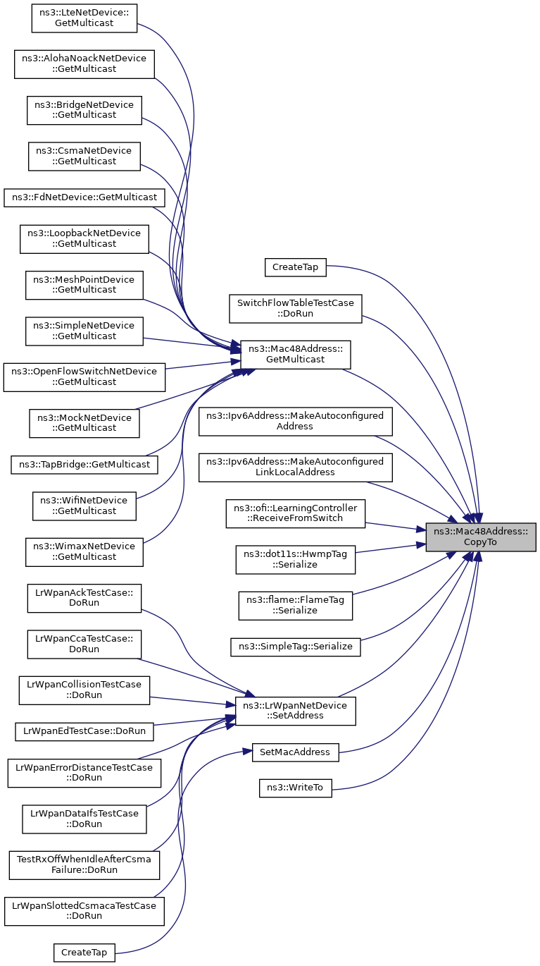 Referenced by ns3::BridgeNetDevice::AddBridgePort(), ns3::MeshPointDevice::AddInterface(), AddSimpleNetDevice(), ns3::OpenFlowSwitchNetDevice::AddSwitchPort(), ContextToMac(), ns3::TapBridge::CreateTap(), ns3::TapBridge::ForwardToBridgedDevice(), ns3::Ipv4ClickRouting::GetMacAddressFromInterfaceId(), ns3::dot11s::HwmpProtocol::Install(), ns3::dot11s::PeerManagementProtocol::Install(), ns3::flame::FlameProtocol::Install(), ns3::aodv::Neighbors::LookupMacAddress(), ns3::dsr::DsrRouteCache::LookupMacAddress(), ns3::Ipv6Address::MakeAutoconfiguredAddress(), ns3::Ipv6Address::MakeAutoconfiguredLinkLocalAddress(), ns3::Ipv6AddressHelper::NewAddress(), ns3::dsr::DsrRouting::PromiscReceive(), ns3::WifiMac::Receive(), ns3::StaWifiMac::Receive(), ns3::Ipv4L3ClickProtocol::Receive(), ns3::Ipv4ClickRouting::Receive(), ns3::TapBridge::ReceiveFromBridgedDevice(), ns3::BridgeNetDevice::ReceiveFromDevice(), ns3::MeshPointDevice::ReceiveFromDevice(), ns3::OpenFlowSwitchNetDevice::ReceiveFromDevice(), ns3::MeshHelper::Report(), ns3::LoopbackNetDevice::Send(), ns3::MeshPointDevice::Send(), ns3::WifiNetDevice::Send(), ns3::WimaxNetDevice::Send(), ns3::BridgeNetDevice::SendFrom(), ns3::CsmaNetDevice::SendFrom(), ns3::FdNetDevice::SendFrom(), ns3::LoopbackNetDevice::SendFrom(), ns3::MeshPointDevice::SendFrom(), ns3::SimpleNetDevice::SendFrom(), ns3::AlohaNoackNetDevice::SendFrom(), ns3::WifiNetDevice::SendFrom(), ns3::WimaxNetDevice::SendFrom(), ns3::MeshPointDevice::SetAddress(), ns3::BridgeNetDevice::SetAddress(), ns3::CsmaNetDevice::SetAddress(), ns3::FdNetDevice::SetAddress(), ns3::LoopbackNetDevice::SetAddress(), ns3::LrWpanNetDevice::SetAddress(), ns3::SimpleNetDevice::SetAddress(), ns3::OpenFlowSwitchNetDevice::SetAddress(), ns3::PointToPointNetDevice::SetAddress(), ns3::AlohaNoackNetDevice::SetAddress(), ns3::TapBridge::SetAddress(), ns3::WifiNetDevice::SetAddress(), and ns3::WimaxNetDevice::SetAddress().