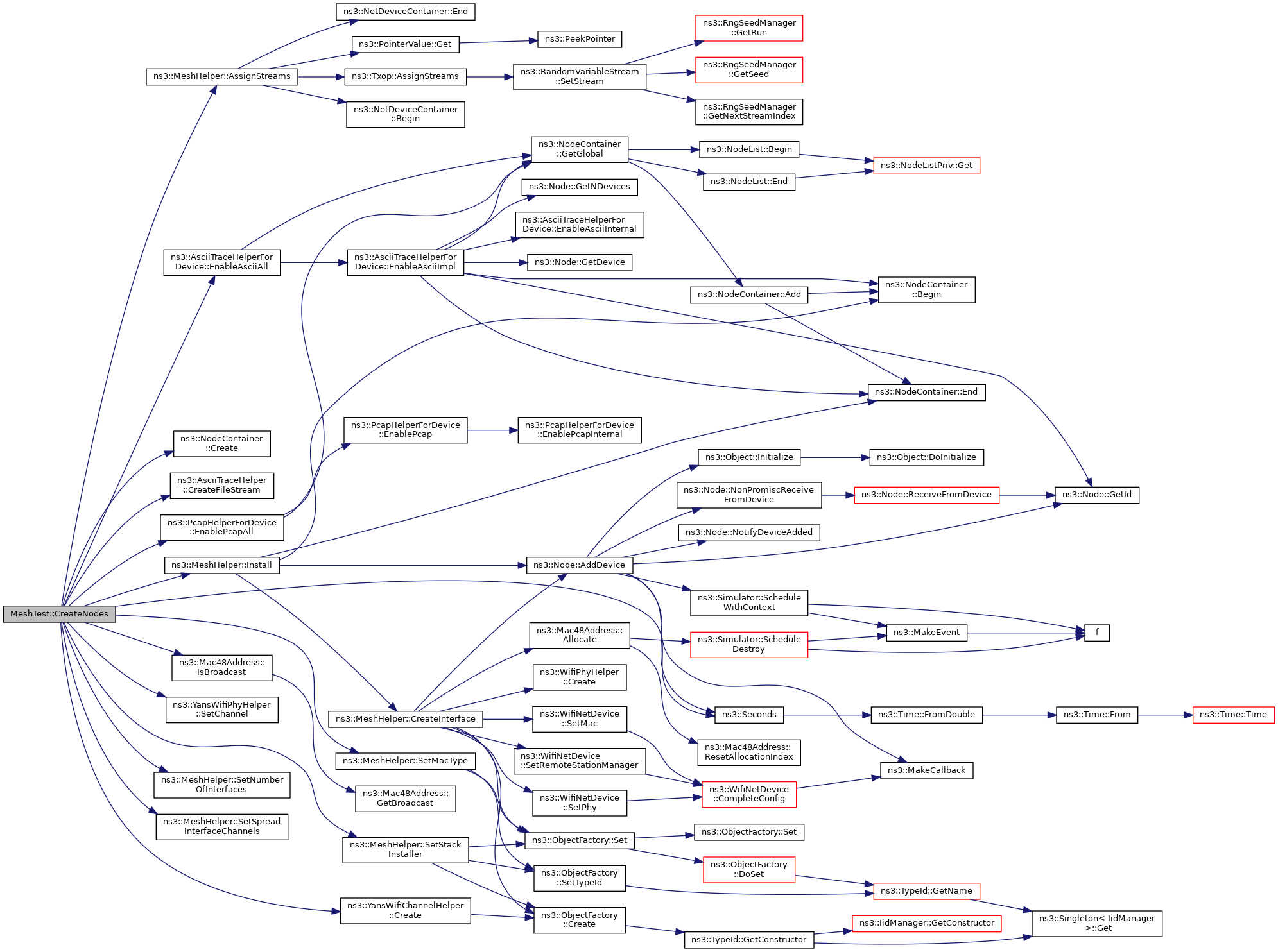 References ns3::MeshHelper::AssignStreams(), ns3::YansWifiChannelHelper::Create(), ns3::NodeContainer::Create(), ns3::AsciiTraceHelper::CreateFileStream(), ns3::AsciiTraceHelperForDevice::EnableAsciiAll(), ns3::PcapHelperForDevice::EnablePcapAll(), ns3::MeshHelper::Install(), ns3::Mac48Address::IsBroadcast(), m_ascii, m_chan, m_nIfaces, m_pcap, m_randomStart, m_root, m_stack, m_step, m_xSize, m_ySize, mesh, meshDevices, third::mobility, nodes, ns3::Seconds(), ns3::YansWifiPhyHelper::SetChannel(), ns3::MeshHelper::SetMacType(), ns3::MeshHelper::SetNumberOfInterfaces(), ns3::MeshHelper::SetSpreadInterfaceChannels(), and ns3::MeshHelper::SetStackInstaller().
