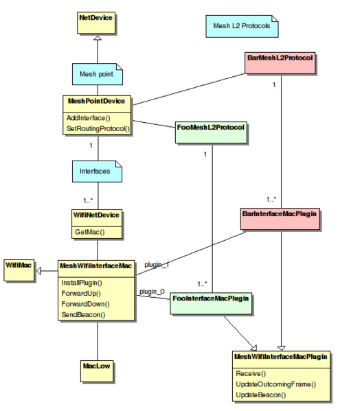 The main part of MAC-layer routing model is specific type of a network device – ns3::MeshPointDevice. Being an interface to upper-layer protocols, it provides routing functionality hidden from upper-layer protocols, by means of ns3::MeshL2RoutingProtocol.