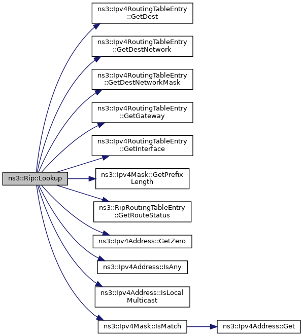 This lookup is used in the forwarding process. The packet is handed over to the Ipv4RoutingProtocol, and will get forwarded onward by one of the callbacks. The Linux equivalent is ip_route_input(). There are four valid outcomes, and a matching callbacks to handle each.