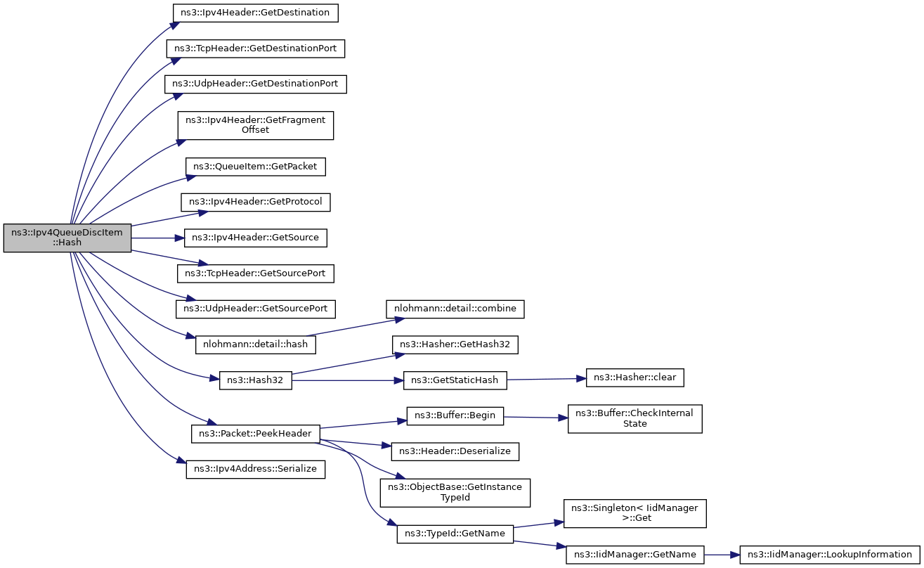 References ns3::Ipv4Header::GetDestination(), ns3::TcpHeader::GetDestinationPort(), ns3::UdpHeader::GetDestinationPort(), ns3::Ipv4Header::GetFragmentOffset(), ns3::QueueItem::GetPacket(), ns3::Ipv4Header::GetProtocol(), ns3::Ipv4Header::GetSource(), ns3::TcpHeader::GetSourcePort(), ns3::UdpHeader::GetSourcePort(), nlohmann::detail::hash(), ns3::Hash32(), m_header, NS_LOG_DEBUG, NS_LOG_FUNCTION, NS_LOG_WARN, ns3::Packet::PeekHeader(), and ns3::Ipv4Address::Serialize().