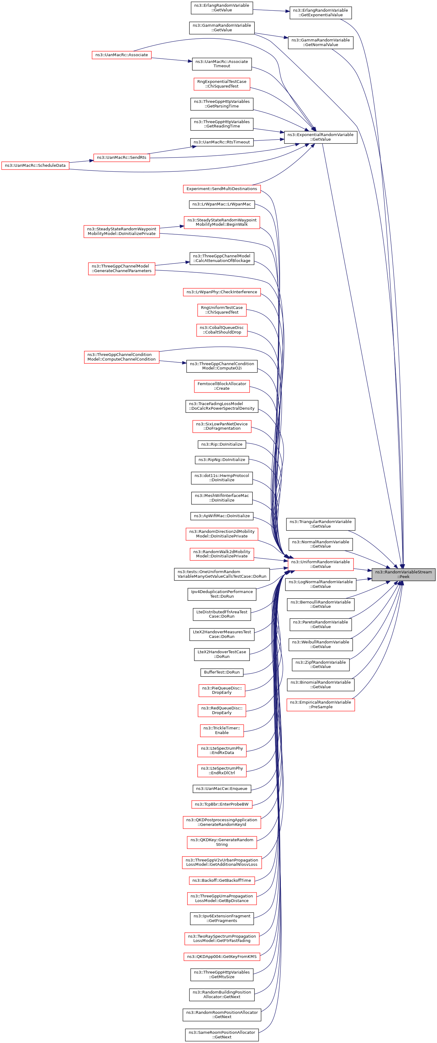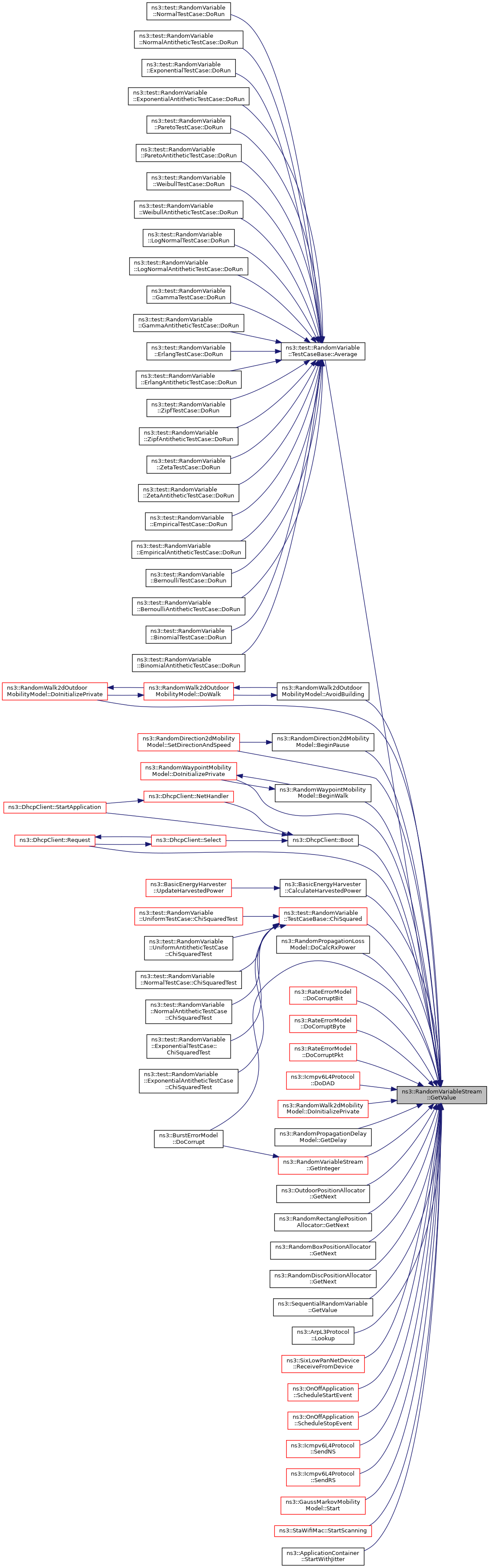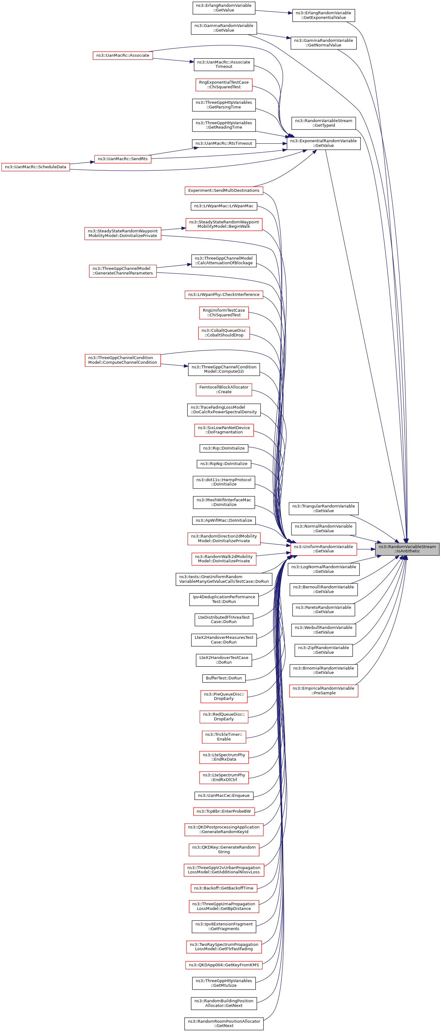 Referenced by ns3::test::RandomVariable::TestCaseBase::Average(), ns3::RandomWalk2dOutdoorMobilityModel::AvoidBuilding(), ns3::RandomDirection2dMobilityModel::BeginPause(), ns3::RandomWaypointMobilityModel::BeginWalk(), ns3::DhcpClient::Boot(), ns3::BasicEnergyHarvester::CalculateHarvestedPower(), ns3::test::RandomVariable::TestCaseBase::ChiSquared(), ns3::RandomPropagationLossModel::DoCalcRxPower(), ns3::BurstErrorModel::DoCorrupt(), ns3::RateErrorModel::DoCorruptBit(), ns3::RateErrorModel::DoCorruptByte(), ns3::RateErrorModel::DoCorruptPkt(), ns3::Icmpv6L4Protocol::DoDAD(), ns3::RandomWalk2dOutdoorMobilityModel::DoInitializePrivate(), ns3::RandomWalk2dMobilityModel::DoInitializePrivate(), ns3::RandomWaypointMobilityModel::DoInitializePrivate(), ns3::RandomPropagationDelayModel::GetDelay(), GetInteger(), ns3::OutdoorPositionAllocator::GetNext(), ns3::RandomRectanglePositionAllocator::GetNext(), ns3::RandomBoxPositionAllocator::GetNext(), ns3::RandomDiscPositionAllocator::GetNext(), ns3::SequentialRandomVariable::GetValue(), ns3::ArpL3Protocol::Lookup(), ns3::SixLowPanNetDevice::ReceiveFromDevice(), ns3::DhcpClient::Request(), ns3::OnOffApplication::ScheduleStartEvent(), ns3::OnOffApplication::ScheduleStopEvent(), ns3::Icmpv6L4Protocol::SendNS(), ns3::Icmpv6L4Protocol::SendRS(), ns3::RandomDirection2dMobilityModel::SetDirectionAndSpeed(), ns3::GaussMarkovMobilityModel::Start(), ns3::StaWifiMac::StartScanning(), and ns3::ApplicationContainer::StartWithJitter().