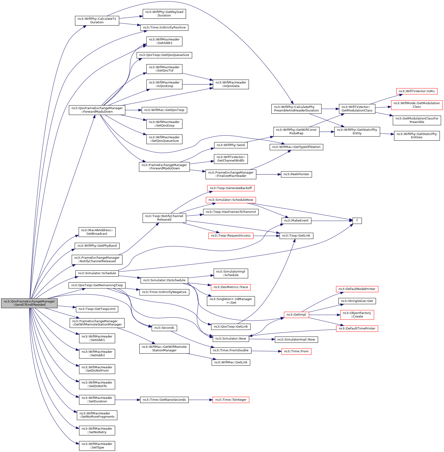 References ns3::WifiPhy::CalculateTxDuration(), ForwardMpduDown(), ns3::WifiMacHeader::GetAddr1(), ns3::Mac48Address::GetBroadcast(), ns3::WifiPhy::GetPhyBand(), ns3::QosTxop::GetRemainingTxop(), ns3::Txop::GetTxopLimit(), ns3::FrameExchangeManager::GetWifiRemoteStationManager(), ns3::Time::IsStrictlyPositive(), ns3::FrameExchangeManager::m_allowedWidth, m_edca, ns3::FrameExchangeManager::m_linkId, ns3::FrameExchangeManager::m_phy, ns3::FrameExchangeManager::m_self, ns3::FrameExchangeManager::NotifyChannelReleased(), NS_ASSERT, NS_LOG_DEBUG, NS_LOG_FUNCTION, ns3::Simulator::Schedule(), ns3::Seconds(), ns3::WifiMacHeader::SetAddr1(), ns3::WifiMacHeader::SetAddr2(), ns3::WifiMacHeader::SetDsNotFrom(), ns3::WifiMacHeader::SetDsNotTo(), ns3::WifiMacHeader::SetDuration(), ns3::WifiMacHeader::SetNoMoreFragments(), ns3::WifiMacHeader::SetNoRetry(), ns3::WifiMacHeader::SetType(), and ns3::WIFI_MAC_CTL_END.