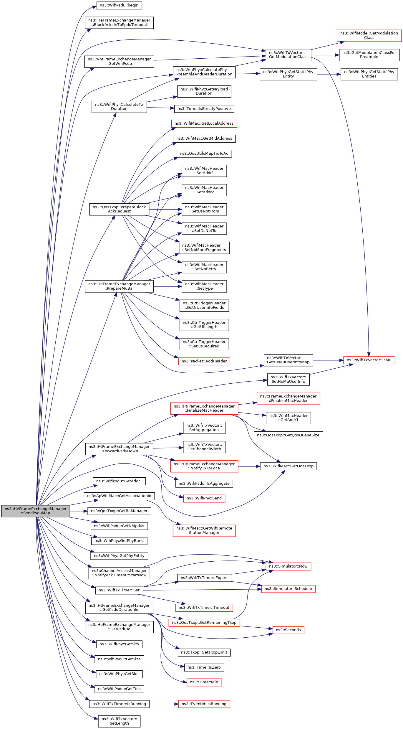 References ns3::WifiPsdu::begin(), BlockAcksInTbPpduTimeout(), ns3::WifiPhy::CalculatePhyPreambleAndHeaderDuration(), ns3::WifiPhy::CalculateTxDuration(), ns3::WifiAcknowledgment::DL_MU_AGGREGATE_TF, ns3::WifiAcknowledgment::DL_MU_BAR_BA_SEQUENCE, ns3::WifiAcknowledgment::DL_MU_TF_MU_BAR, ns3::HtFrameExchangeManager::ForwardPsduDown(), ns3::WifiPsdu::GetAddr1(), ns3::ApWifiMac::GetAssociationId(), ns3::QosTxop::GetBaManager(), ns3::WifiTxVector::GetModulationClass(), ns3::WifiPsdu::GetNMpdus(), ns3::WifiPhy::GetPhyBand(), ns3::WifiPhy::GetPhyEntity(), ns3::HtFrameExchangeManager::GetPsduDurationId(), GetPsduTo(), ns3::WifiMac::GetQosTxop(), ns3::WifiPhy::GetSifs(), ns3::WifiPsdu::GetSize(), ns3::WifiPhy::GetSlot(), ns3::WifiPsdu::GetTids(), ns3::VhtFrameExchangeManager::GetWifiPsdu(), ns3::WifiTxTimer::IsRunning(), ns3::WifiTxParameters::m_acknowledgment, m_apMac, ns3::FrameExchangeManager::m_channelAccessManager, ns3::QosFrameExchangeManager::m_edca, ns3::FrameExchangeManager::m_linkId, ns3::FrameExchangeManager::m_mac, ns3::FrameExchangeManager::m_phy, m_psduMap, m_triggerFrame, m_trigVector, m_txParams, ns3::FrameExchangeManager::m_txTimer, ns3::WifiTxTimer::NOT_RUNNING, ns3::ChannelAccessManager::NotifyAckTimeoutStartNow(), NS_ABORT_MSG_IF, NS_ASSERT, NS_LOG_FUNCTION, ns3::QosTxop::PrepareBlockAckRequest(), PrepareMuBar(), ns3::WifiTxTimer::Set(), ns3::WifiTxVector::SetHeMuUserInfo(), ns3::WifiTxVector::SetLength(), timeout, ns3::WifiTxTimer::WAIT_BLOCK_ACK, ns3::WifiTxTimer::WAIT_BLOCK_ACKS_IN_TB_PPDU, and ns3::WifiTxTimer::WAIT_NORMAL_ACK_AFTER_DL_MU_PPDU.