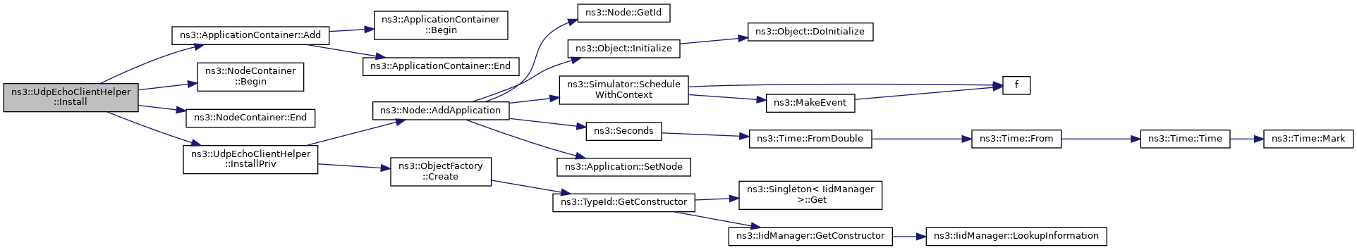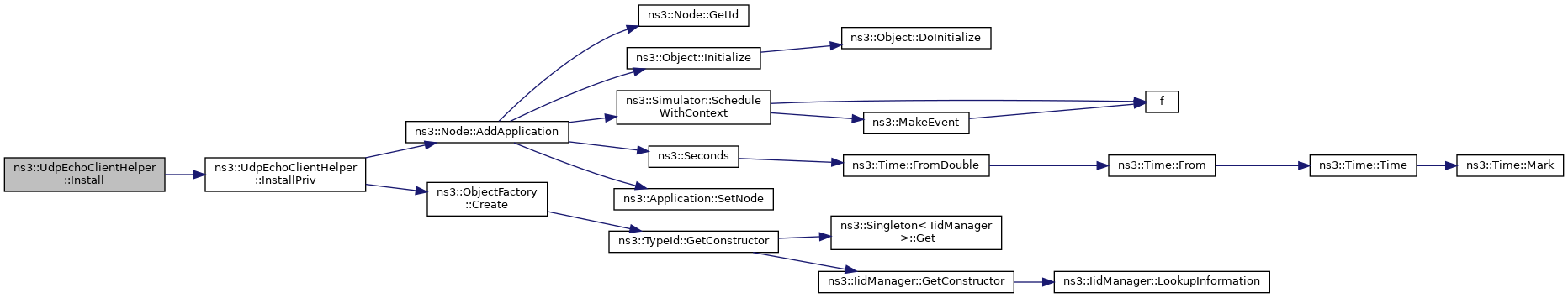Here is the call graph for this function:| ApplicationContainer ns3::UdpEchoClientHelper::Install | ( | Ptr< Node > | node | ) | const |