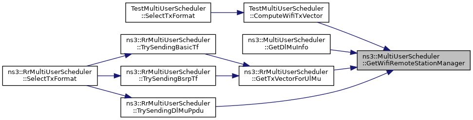 Referenced by AccessReqTimeout(), TestMultiUserScheduler::ComputeWifiTxVector(), DoDispose(), ns3::RrMultiUserScheduler::DoDispose(), ns3::RrMultiUserScheduler::DoInitialize(), GetDlMuInfo(), GetHeFem(), GetMaxSizeOfQosNullAmpdu(), GetTriggerFrame(), ns3::RrMultiUserScheduler::GetTxVectorForUlMu(), GetWifiRemoteStationManager(), NotifyNewAggregate(), ns3::RrMultiUserScheduler::NotifyStationAssociated(), ns3::RrMultiUserScheduler::NotifyStationDeassociated(), ns3::RrMultiUserScheduler::SelectTxFormat(), TestMultiUserScheduler::SelectTxFormat(), SetWifiMac(), ns3::RrMultiUserScheduler::TrySendingBasicTf(), ns3::RrMultiUserScheduler::TrySendingBsrpTf(), and ns3::RrMultiUserScheduler::TrySendingDlMuPpdu().